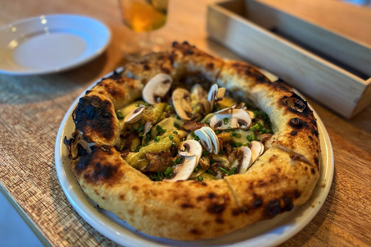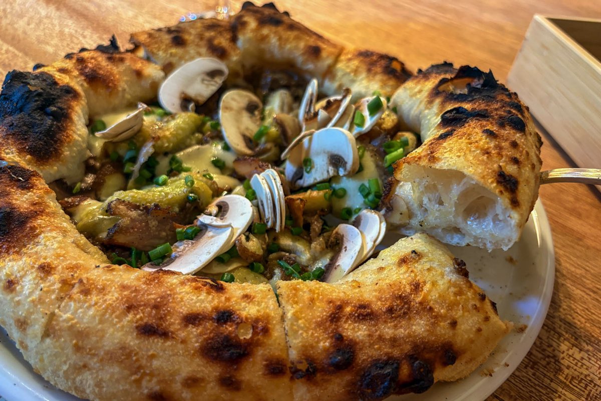 見て~、この断面を。水分をたっぷり含んで、表面はサクッと、食べるともちっふわっ、口の中でとろん。え!!!ナニ??このピッツァ…人生初の美味しすぎる新食感なんだけど。フォカッチャのような、ナポリピッツァのような、そうじゃないような。