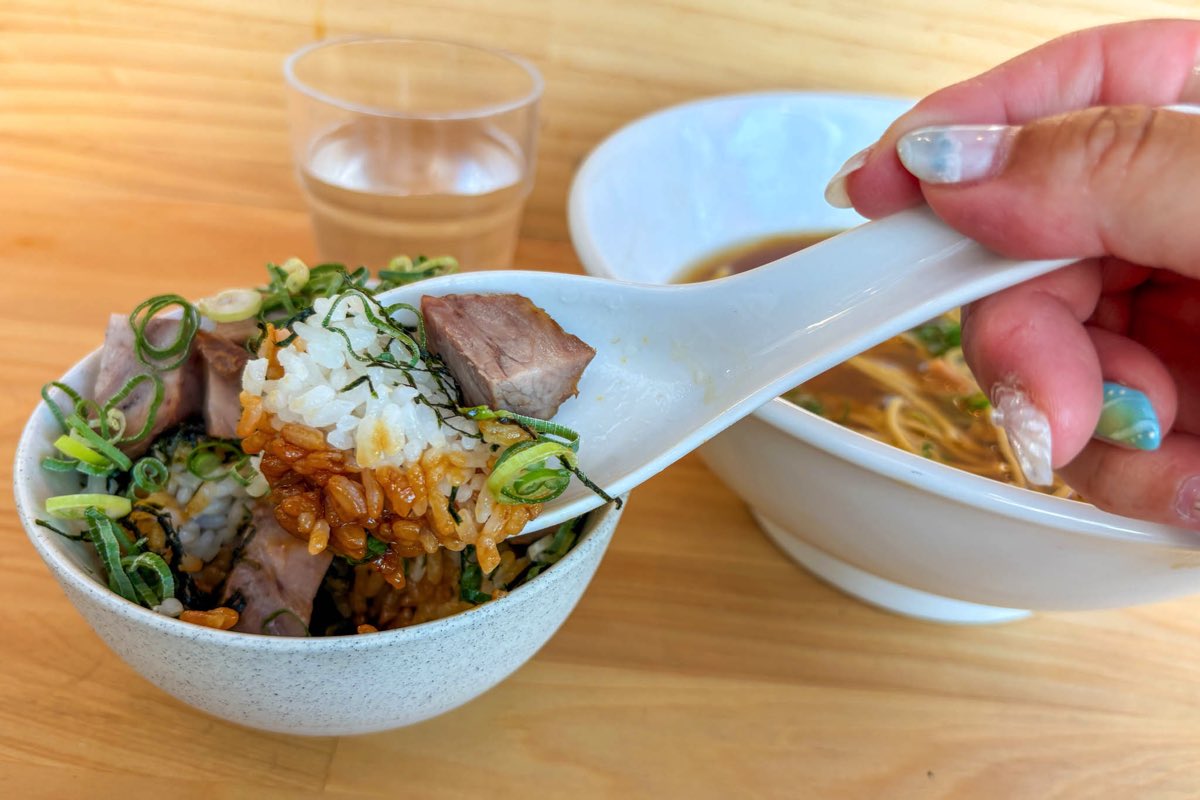 麺はパッツン系の低加水・中細ストレートで歯切れよく、心地いい食感が残る。肉肉しさ溢れる分厚いチャーシューもまたよき。おすすめの特製ミニチャーシュー丼も一緒に。