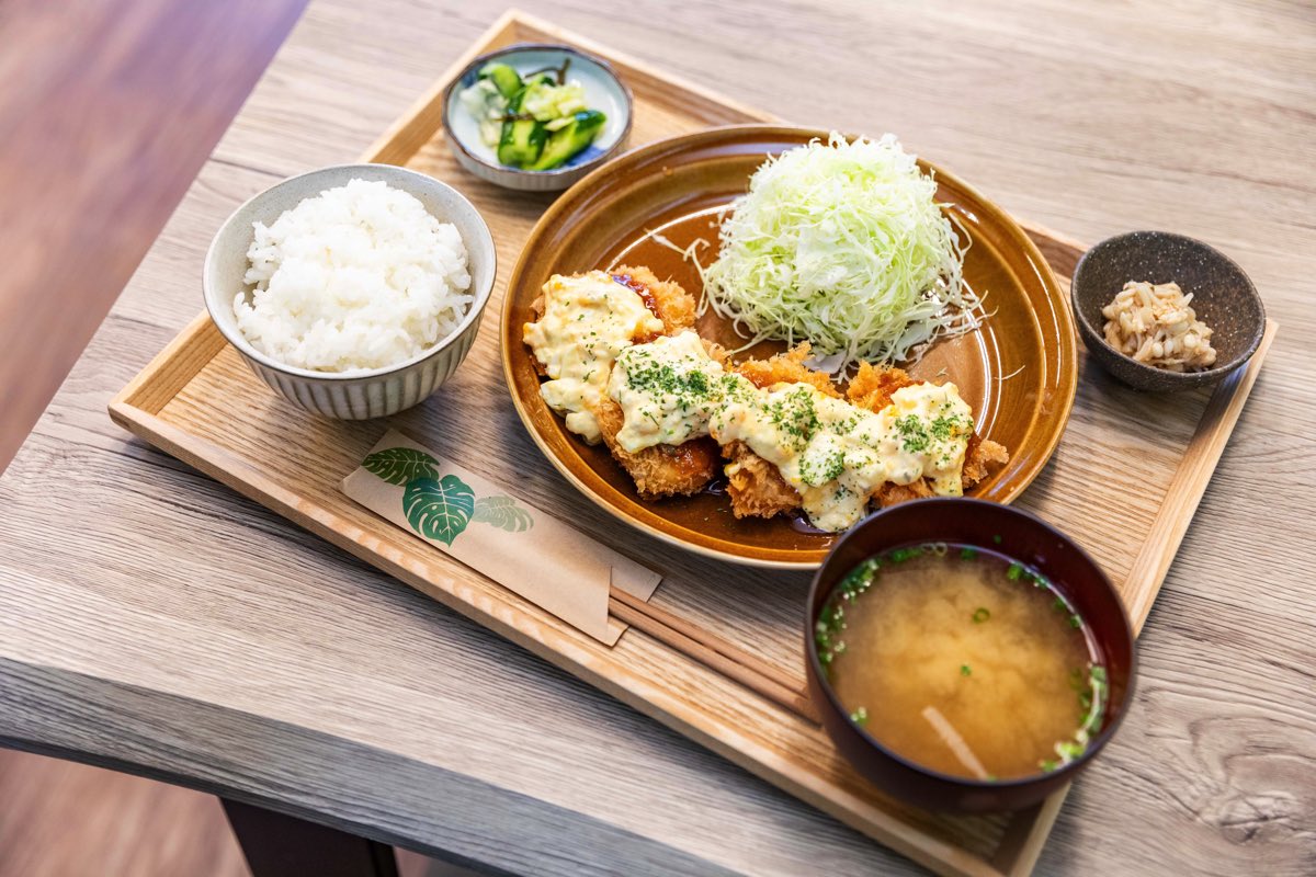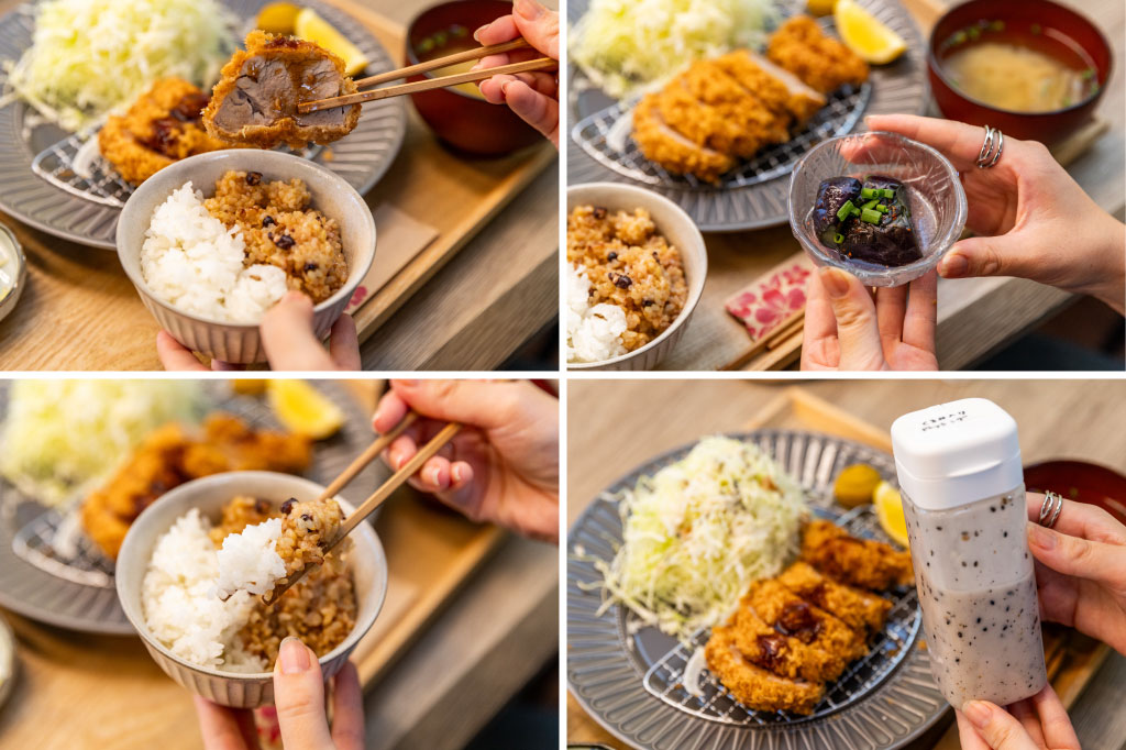 もちろん定番のソースもあるので、自分好みの味変も◎。副菜のナスの揚げ浸しやもっちもちの自家製発酵玄米、白米両方がいただけるご飯など、ひとつで様々な味が楽しめるのも嬉しい。