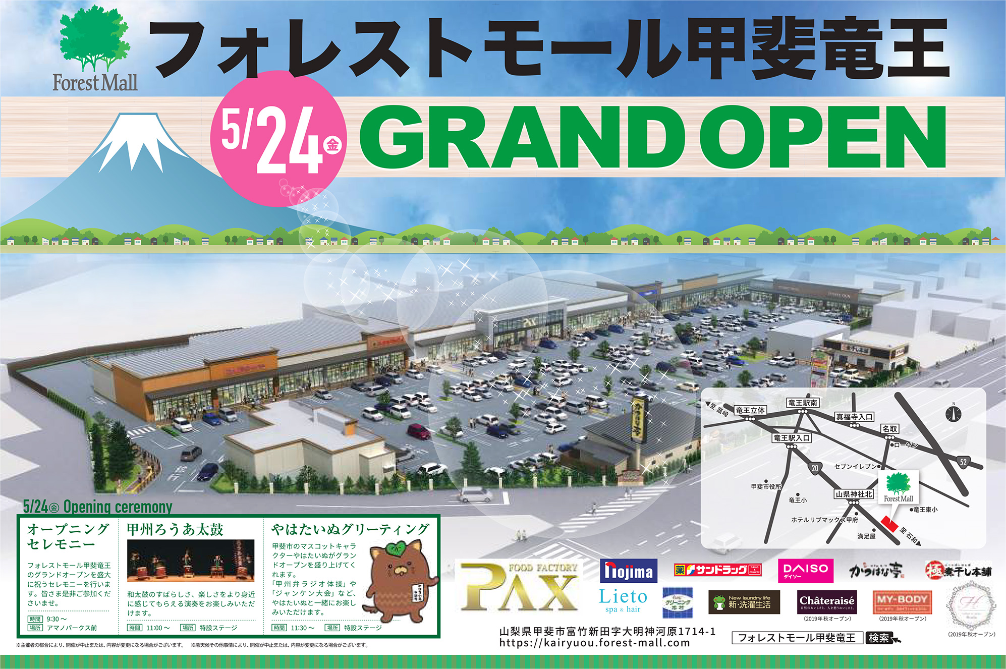 2019年5月24日(金)、山梨県甲斐市に県内3モール目となる複合商業施設「フォレストモール甲斐竜王」(以下「当施設」)をグランドオープンします。