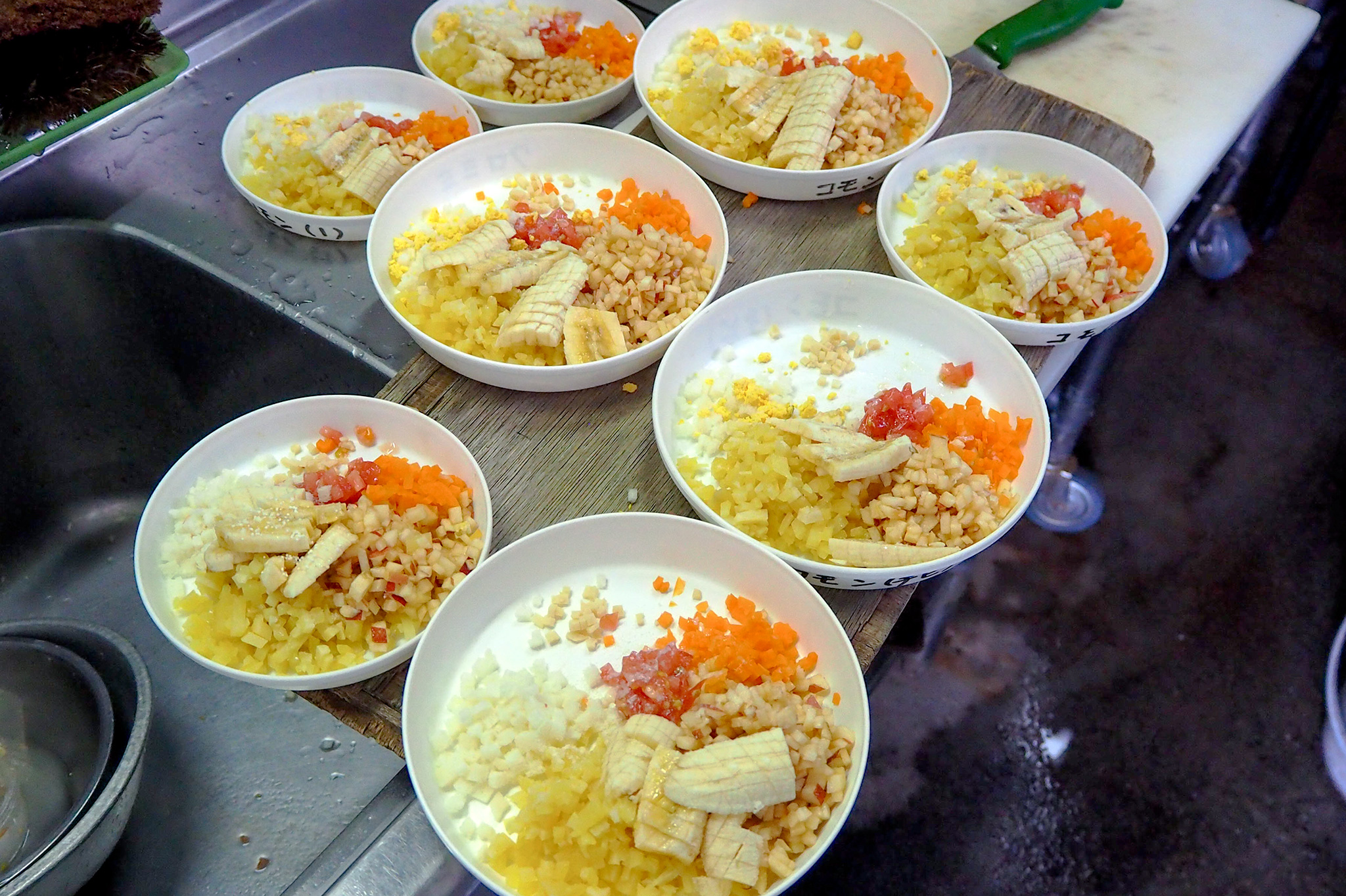手や口が小さいマーモセットたちのために細かくカットする心遣いに飼育員さんの愛情を感じる。