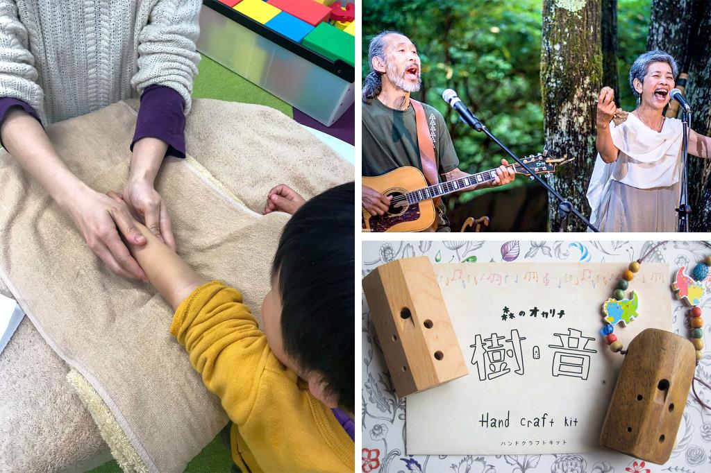 その他にも、木のオカリナ作りができるワークショップや、安全なアロマオイルを使ったマッサージを受けられるリラクゼーションのブースも。
