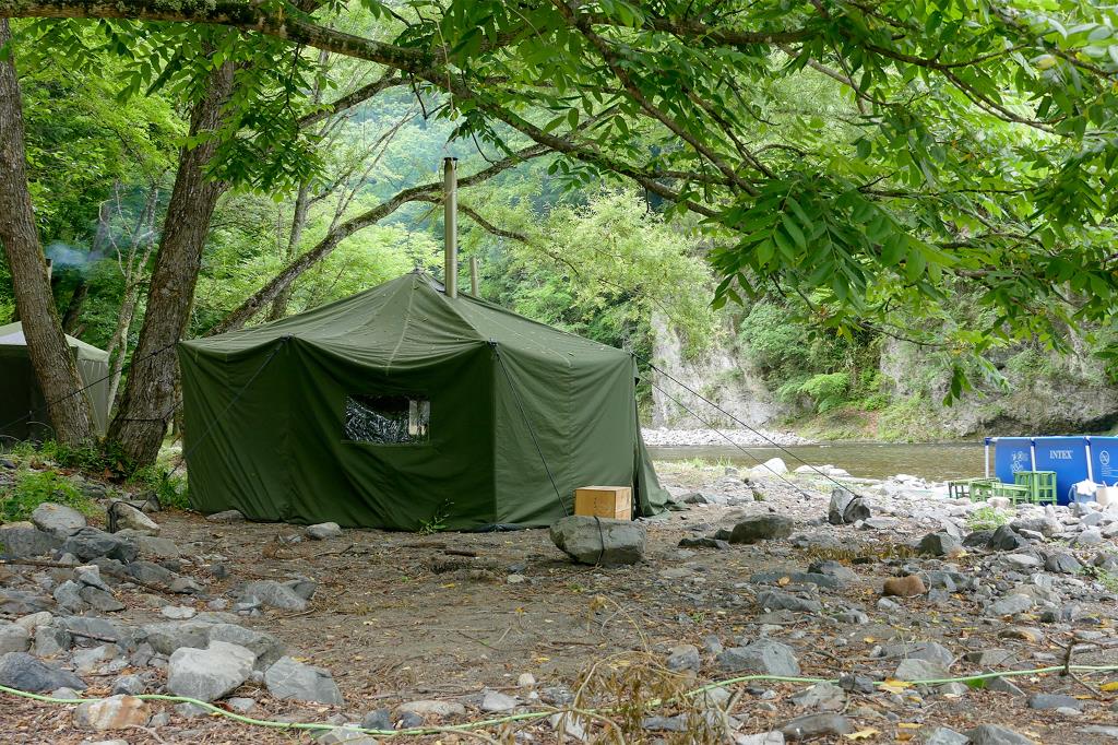 多摩川の源流でもある美しい丹波川の河原に設置されるテントサウナは、とても開放的で室内サウナとは段違いの爽快感!