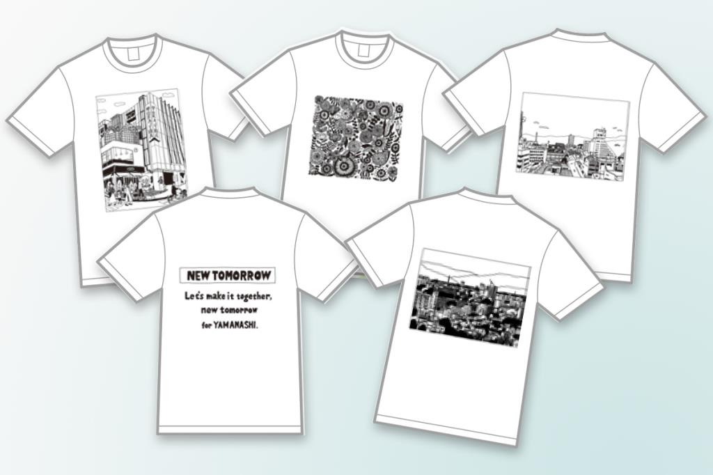 新型コロナウイルスにより様々な影響を受けている学生のみなさんへの支援活動として山梨のいいもの、いいことを若い女性目線でプロデュースして発信する「モモハナ」、山梨の流通アパレルメーカー「むろい」、甲府商工会議所との共同により、“山梨県民が一致団結してこの苦境を乗り越えていこう”という想いを、神山さんがデザインし、作製。