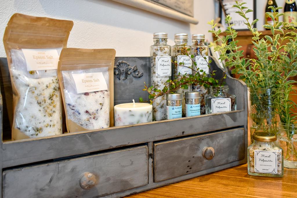 白い家の一室が癒しの空間ソルシエ。〝ファンデーションのいらない素肌へ〟オーガニックコスメにこだわったフェイシャルエステ、身体の状態に合った施術が特徴のオイルトリートメント。身体も心もほぐしてもらえるような癒しの魔法を是非体感してほしい!