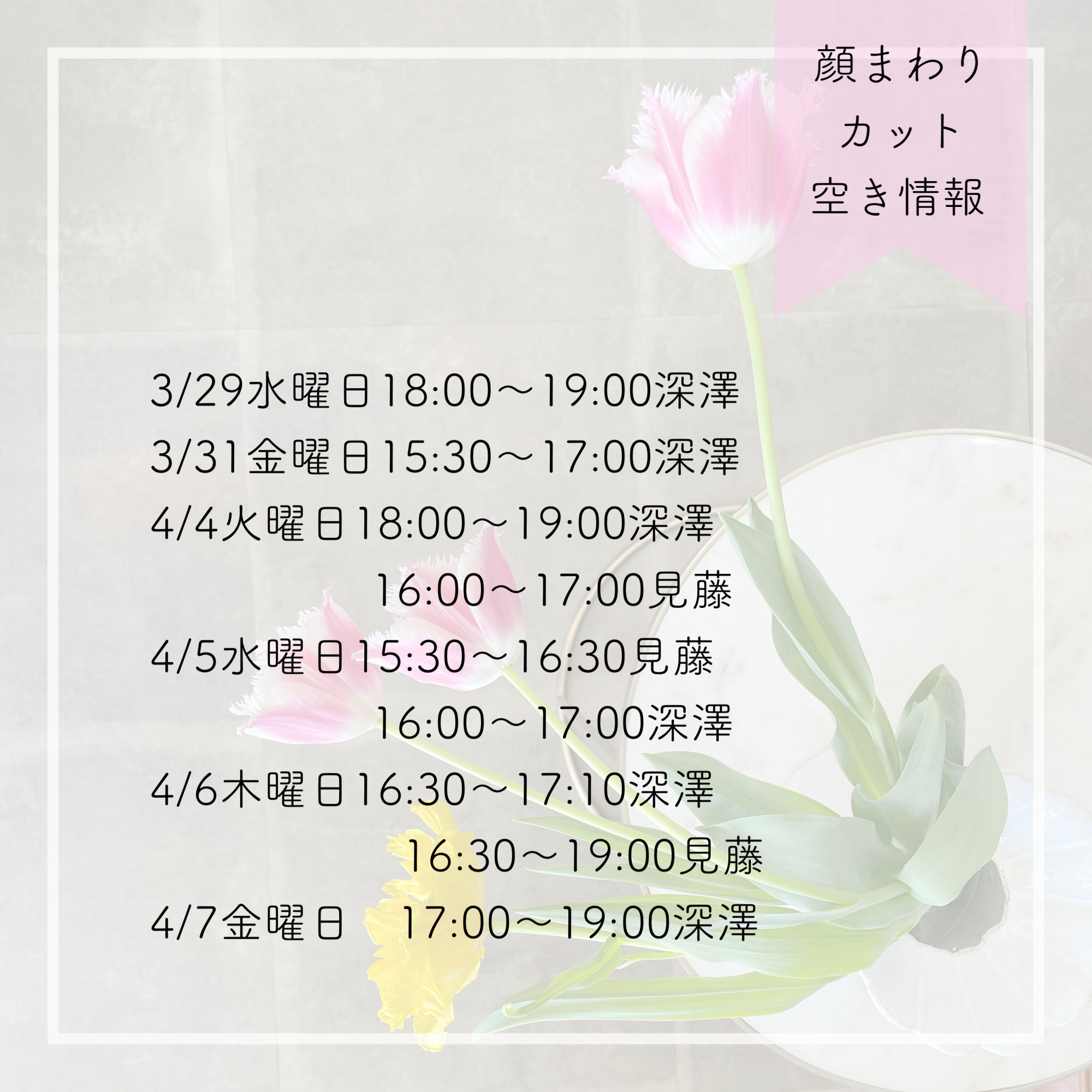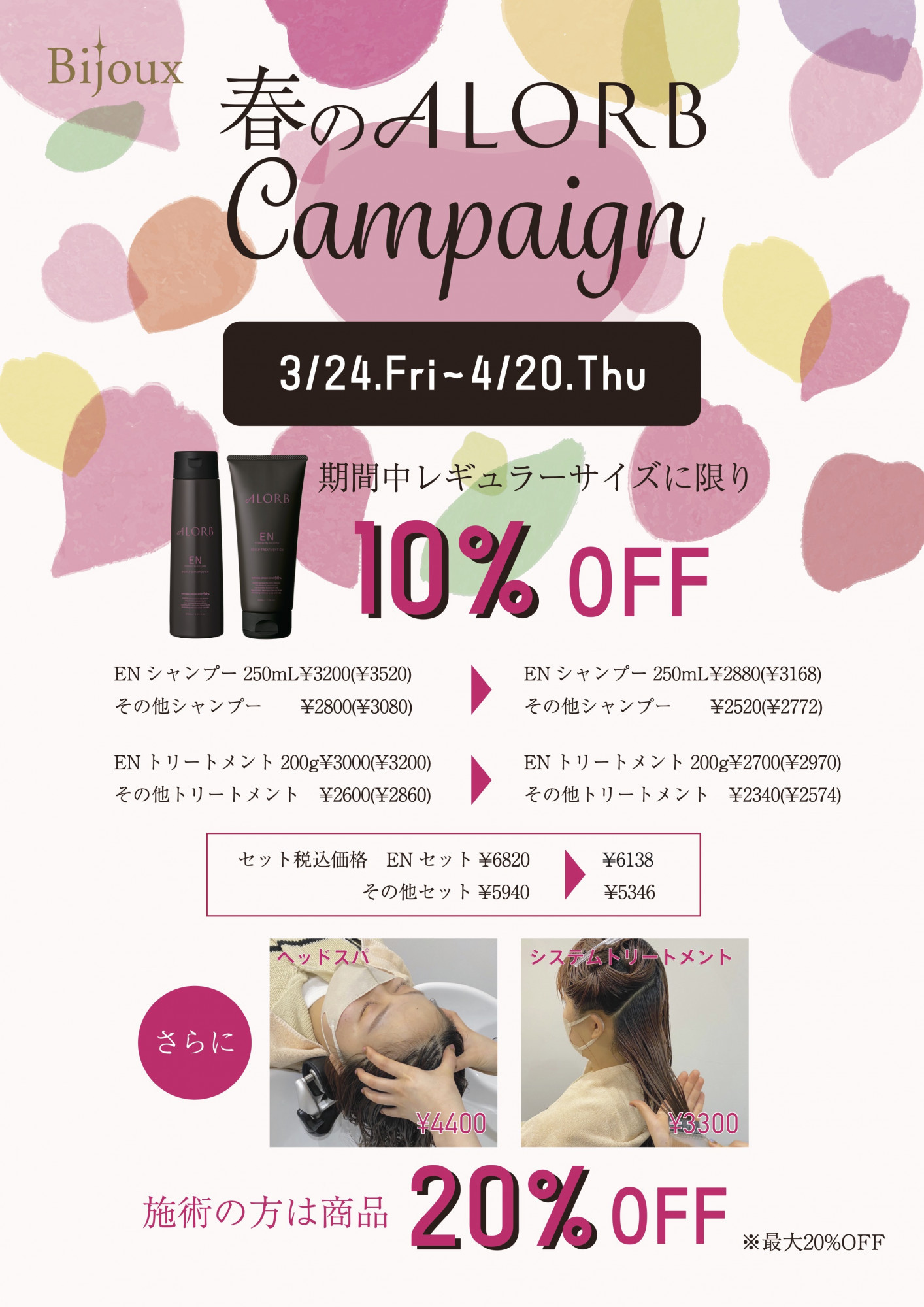 | メニュー | <ヘア> ●カット...4,400円~ ●カラー リタッチ...6,600円~ ●ケアカラー(全体カラーS)...8,800円~ ●トリートメント各種...1,815円~ ●ヘッドスパ各種...4,840円~ ●パーマ...7,150円 ●カット+カラー...11,000円~ ●カット+パーマ...11,550円~ ●カット+トリートメント...6,215円~ ●カット+ヘッドスパ...9,240円 ※15時以降Jr.スタイリスト担当で20%オフ <エステ> ●エンダモロジー体験価格(初回のみ) 45分...13,200円 ●エンダモロジー1回 50分...19,800円 ※10回コースは1回…16,500円 ●フェイシャルライトコース (イオン導入orフォト) 40分...7,700円 ●フェイシャルスタンダードコース (毛穴リメイク、ダームorフォト、イオン導入) 60分...10,780円 ●フォトフェイシャルラグジュアリーコース (ビジュスペシャル) 90分...17,600円 ●ボディリラックス(オイルマッサージ) 60分ライトコース...9,350円 ●ボディデトックス(リンパドレナージュ) 40分...7,150円 ●コンビネーション フェイシャル40分+背中マッサージ20分 ...11,000円 ●全身脱毛 90分...22,000円 ●ブロウリフト…6,050円 ※その他、コース多数あり ※すべて税込 |