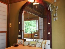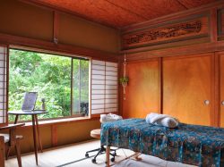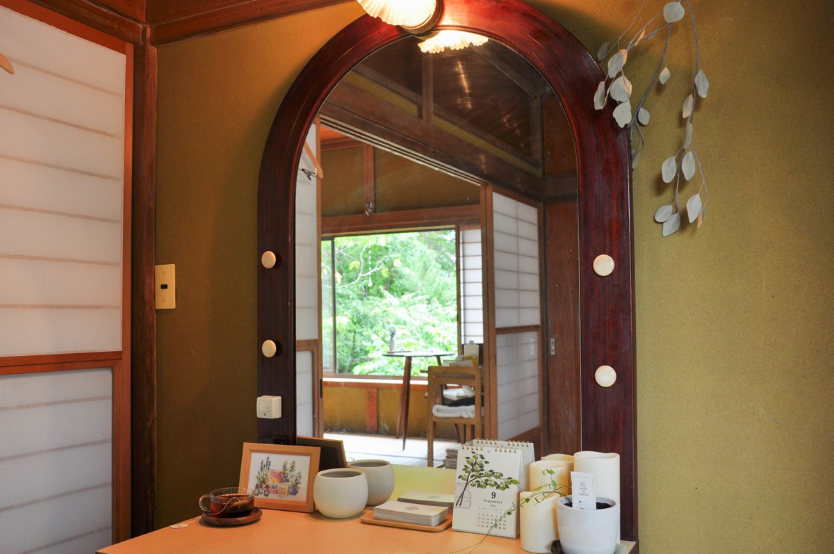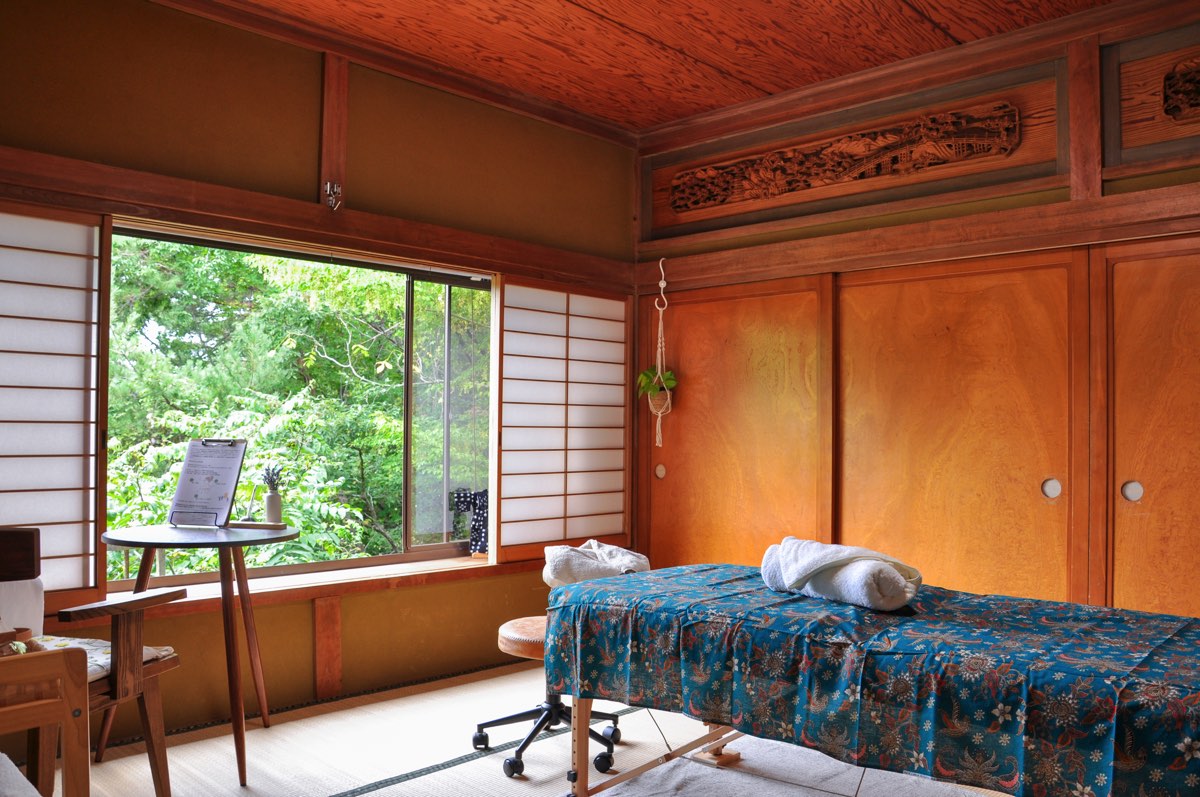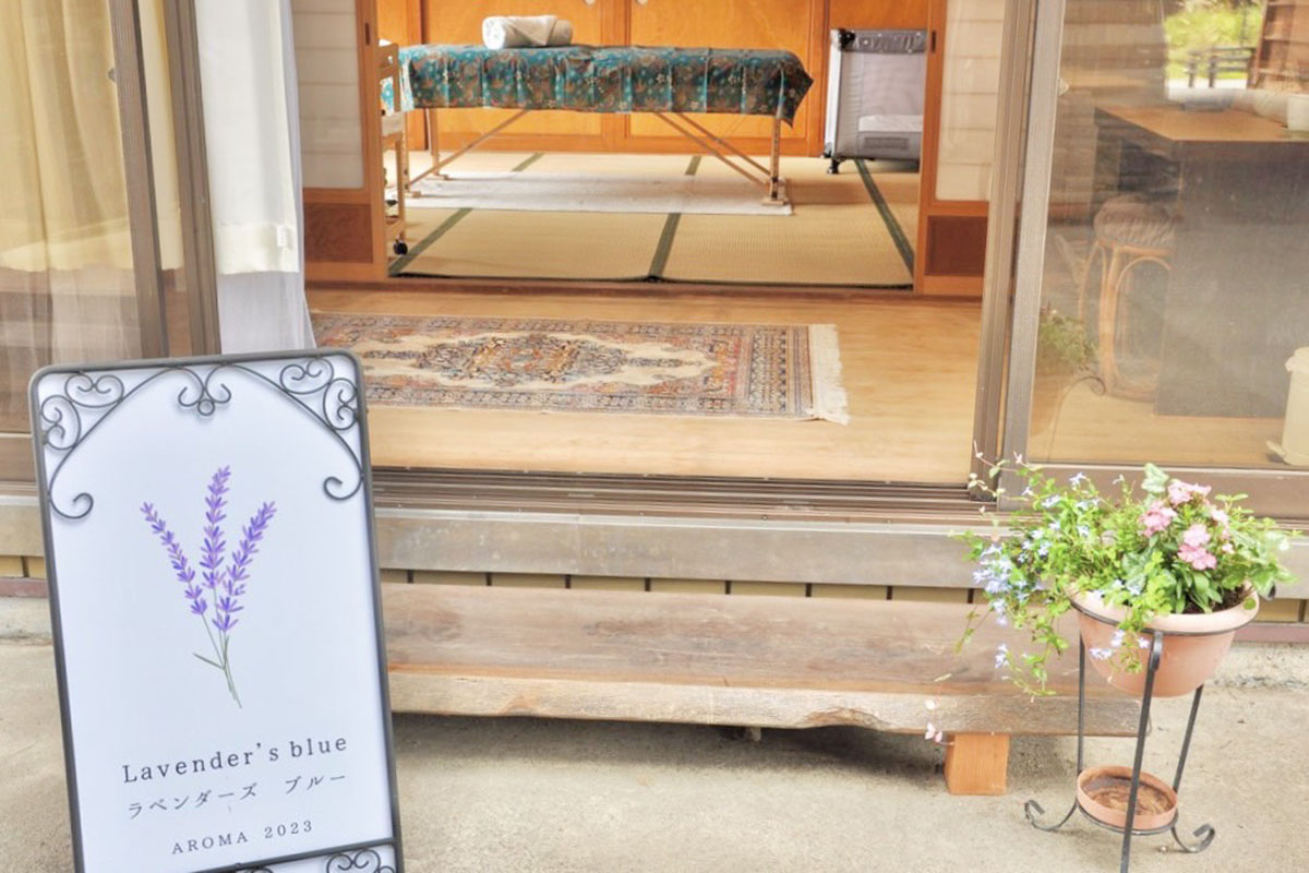 忍野村の自然の中に佇む、完全予約制のアロマトリートメントサロン「Lavender’s blue」。古民家の天然木を基調とした室内と窓からは緑と風を感じる落ち着いた雰囲気。