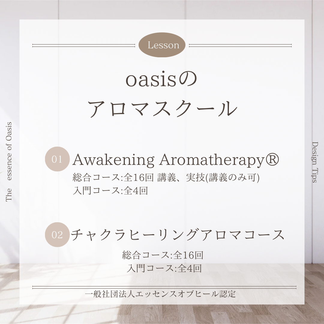 アロマスクールも開講しているので興味のある方は問い合わせてみて♪オアシスで極上のアロマ体験をしてみてはいかが?