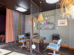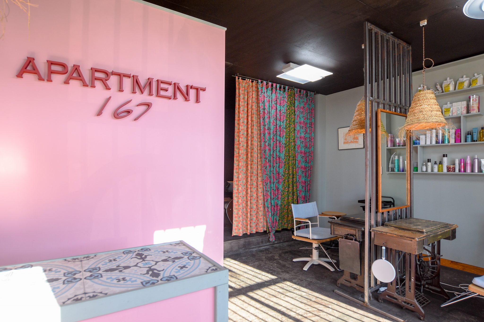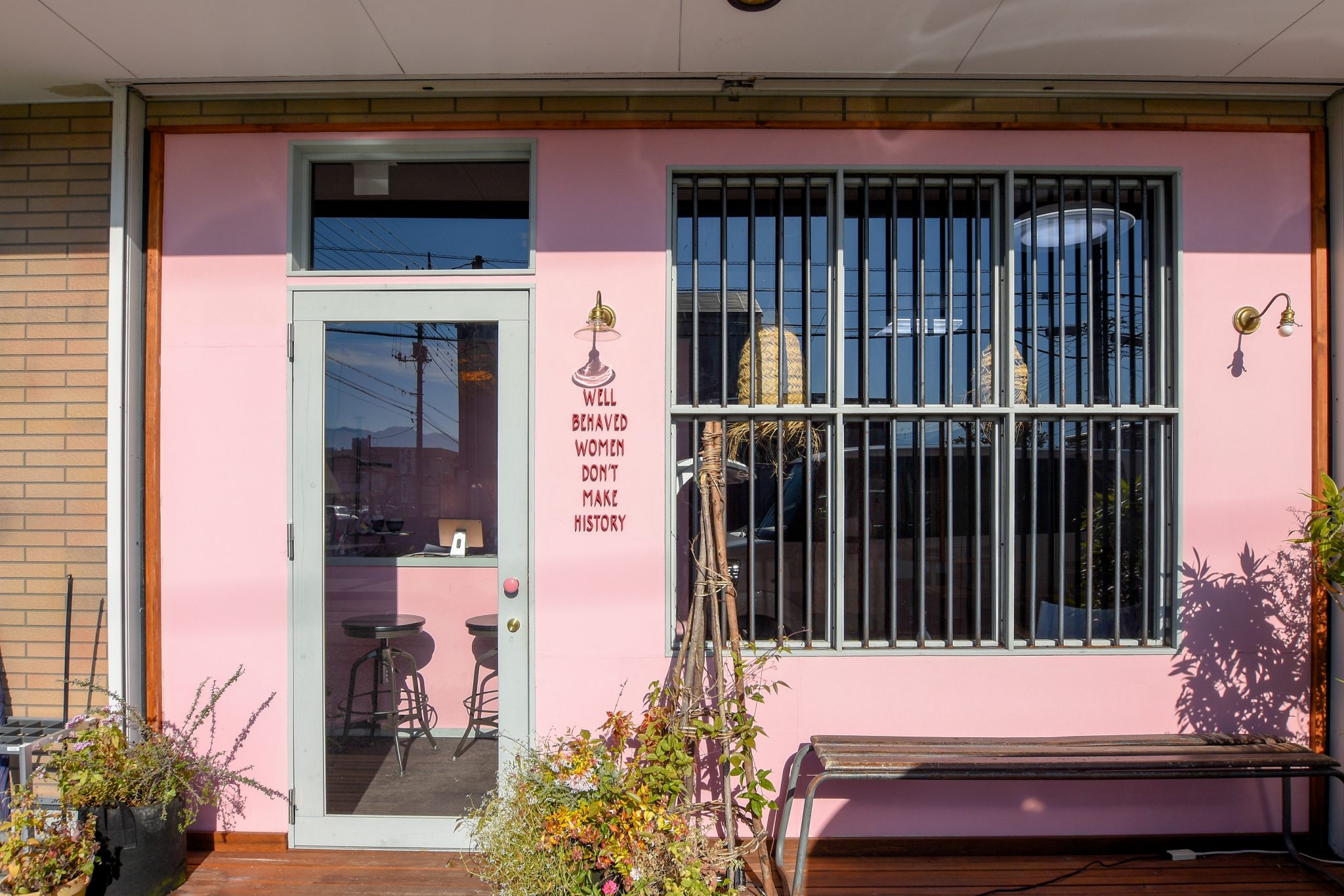 イオンモールから車で5分、ピンクの外観が可愛らしいヘアサロン。