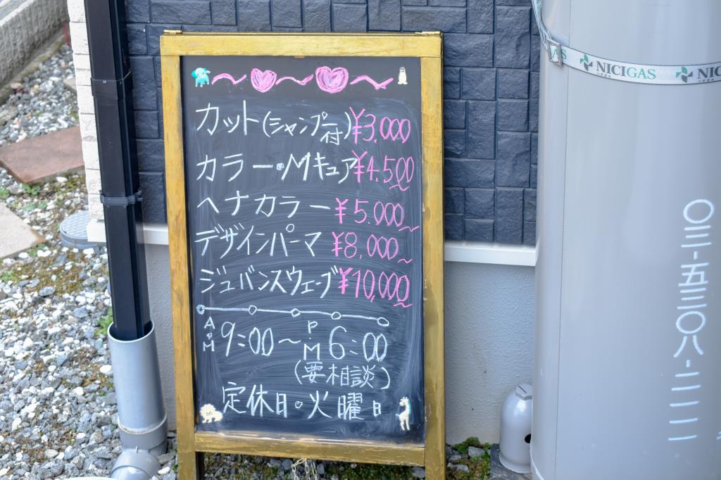 | メニュー | ●カット(シャンプー付)…3,000円 ●カラー・Mキュア…4,500円~円 ●デザインパーマ…8,000円~円 ※全て税込み |