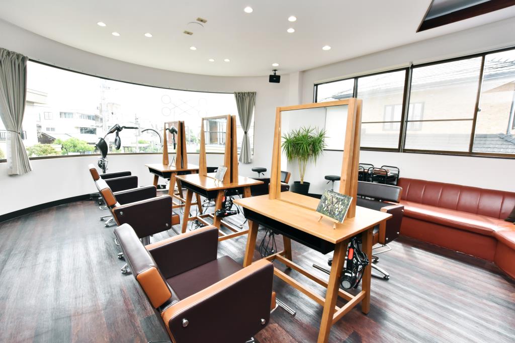 Remercie甲府市伊勢にある美容院Remercie。ブラウンとホワイトを基調とした明るく落ち着きのある店内に、少... -