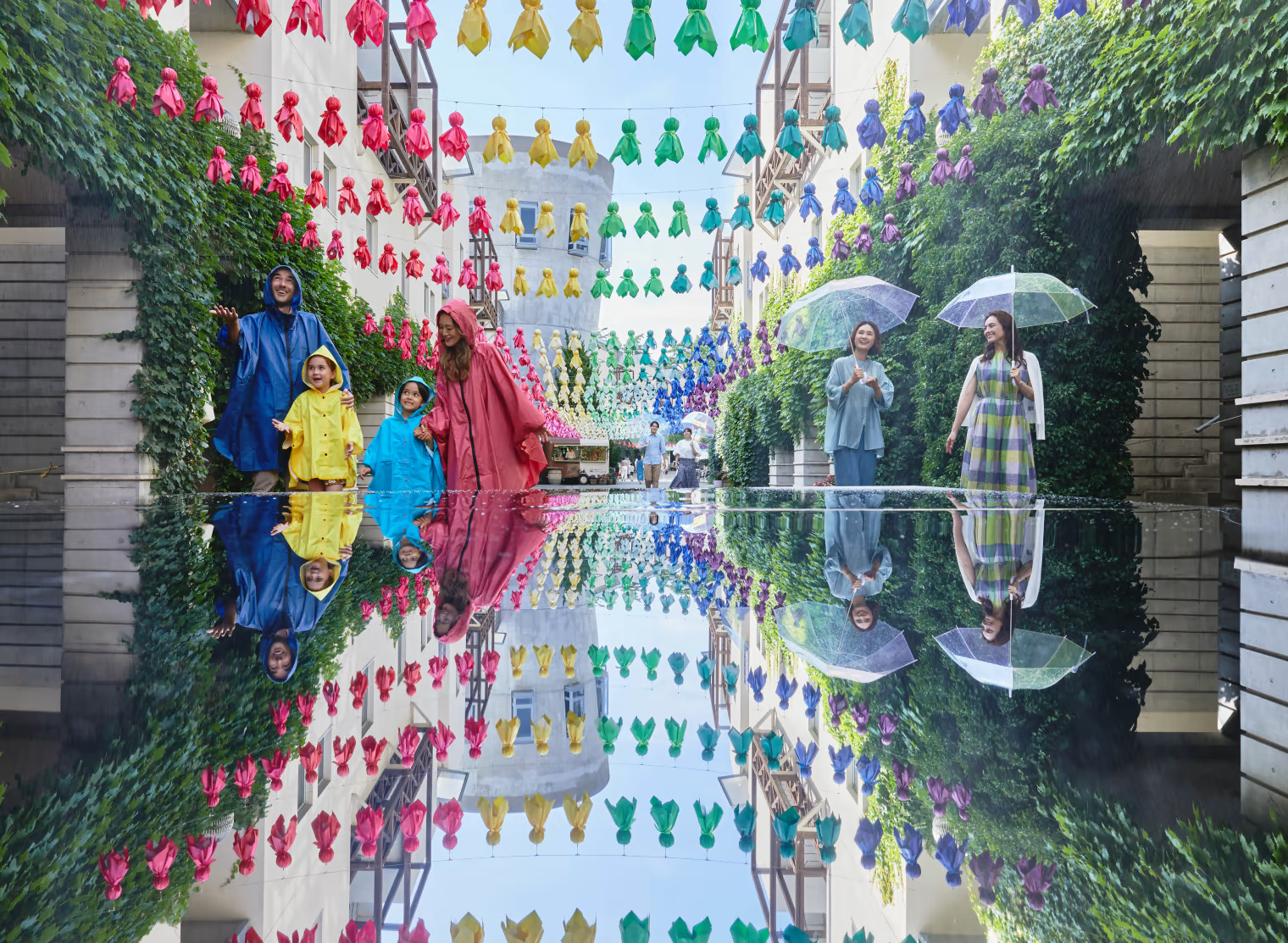 全⻑160mのメインストリート「ピーマン通り」に、 晴れを願う「てるてる坊主」ではなく、雨を待ちわびる「ふれふれ坊主」が並びます。ふれふれ坊主は全て、使われなくなった傘をアップサイクルしたものです。