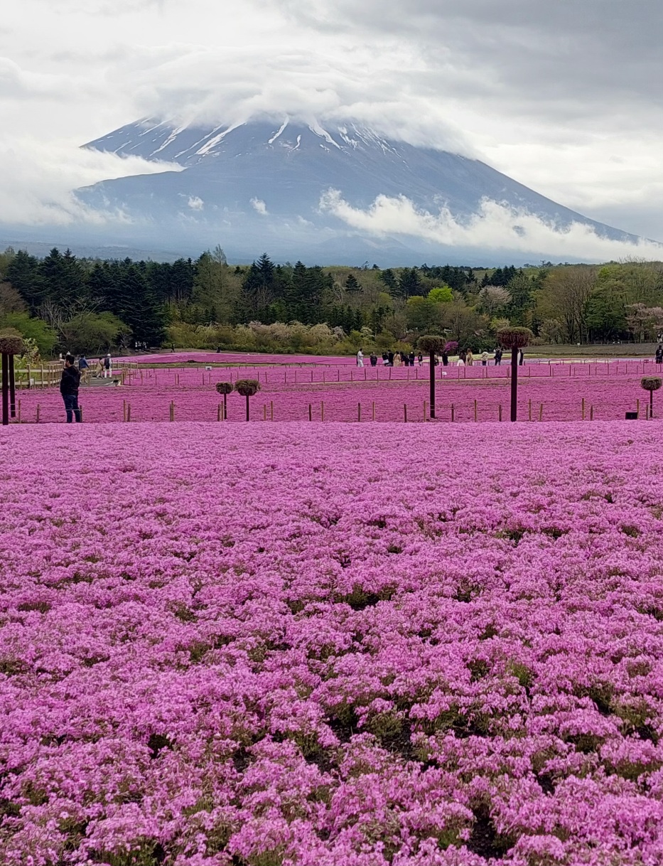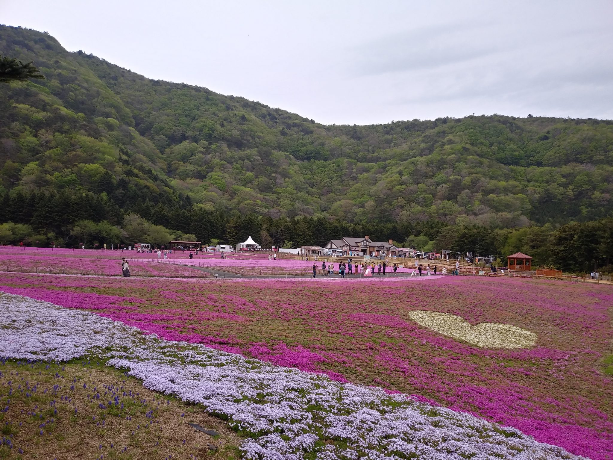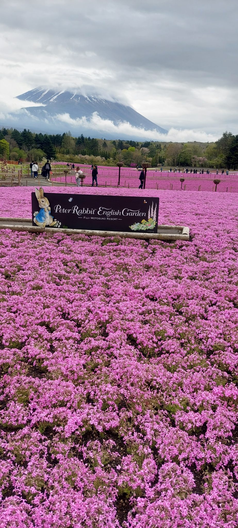 富士山のブルーと芝桜のピンクがキレイに見えるはずでしたが、あいにく富士山が雲隠れしちゃいました