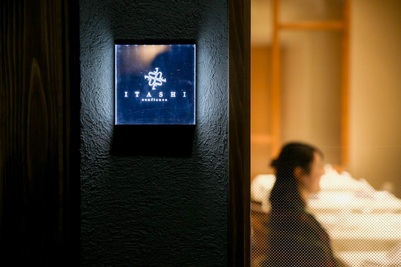 特別わかりづらい場所というわけでもないのに、隠れ家のような密やかな雰囲気が漂う。ガラスのファサードをやわらかな光が透過し、小さな木の扉はささやかな非日常への入口。夕暮れが暗闇に包まれたら、“ITASHI”という美食の劇場が幕を開ける。遊び心とトラディショナルが見事に競演する、麗しのフレンチへようこそ。