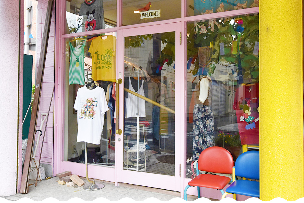 ピンクとイエローのポップな外観が目印の古着屋Pine。
