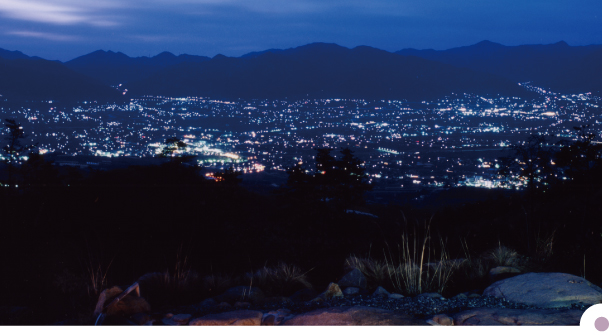 朝一番の温泉は日の出1時間前に始まり、まだまだ夜景が残っている。