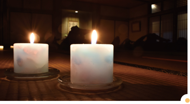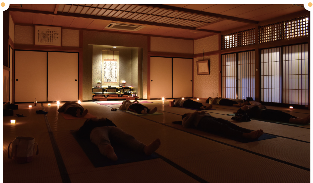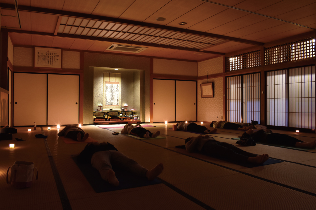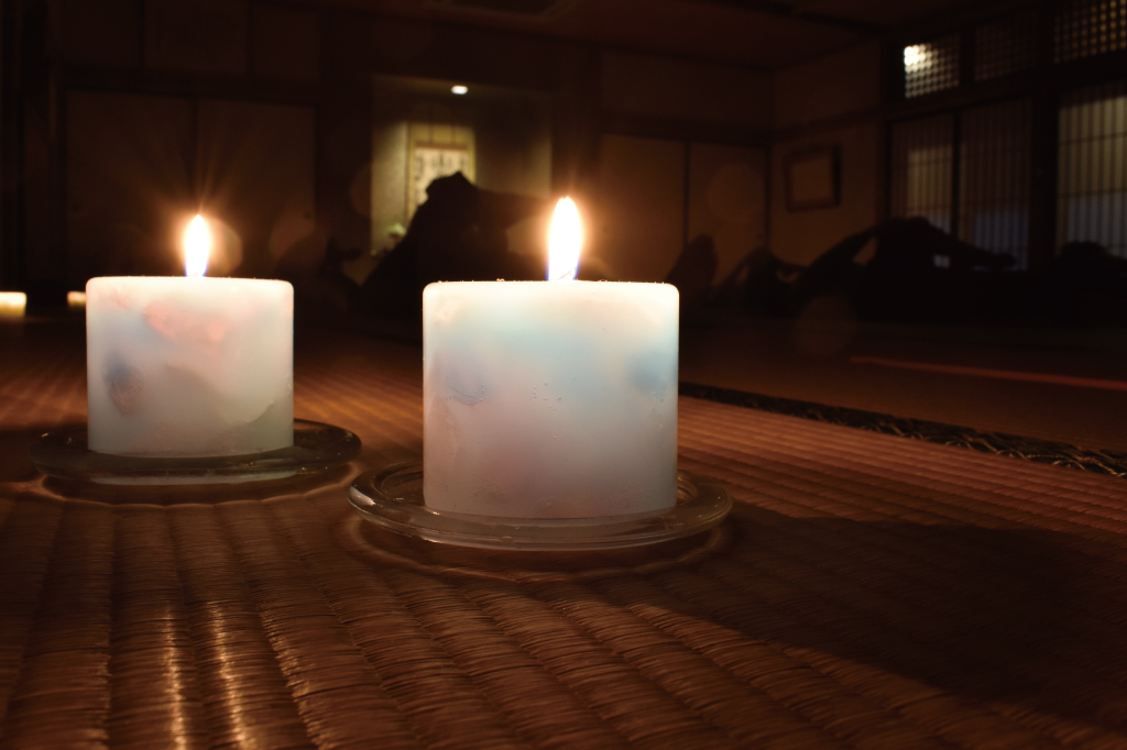 お寺の畳の上で、キャンドルの炎を眺めながら瞑想するキャンドルヨガ(1500円)。