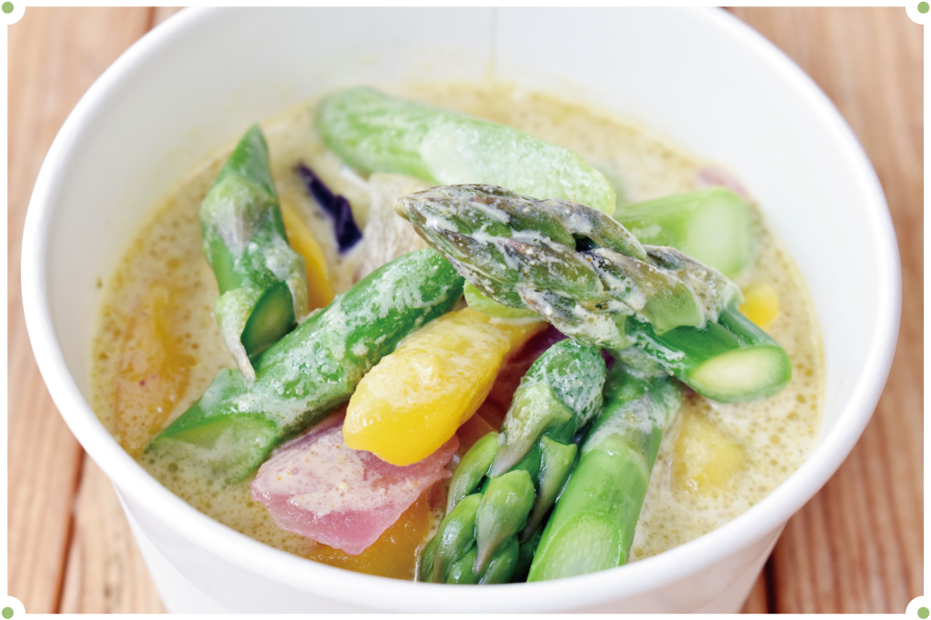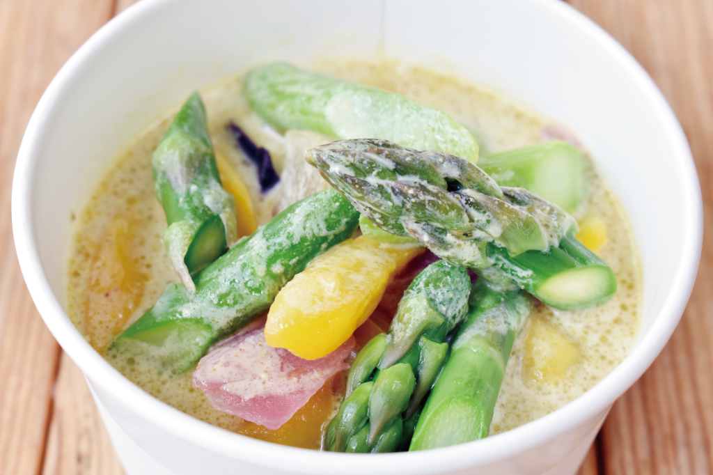 ココナッツミルクでマイルドに仕上げ、ピリッとした辛さの中にも野菜の甘さを優しく感じることができる。