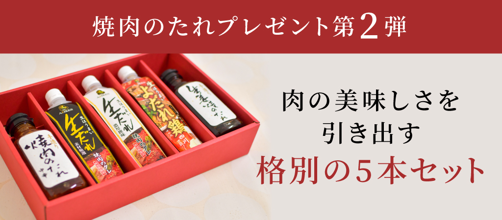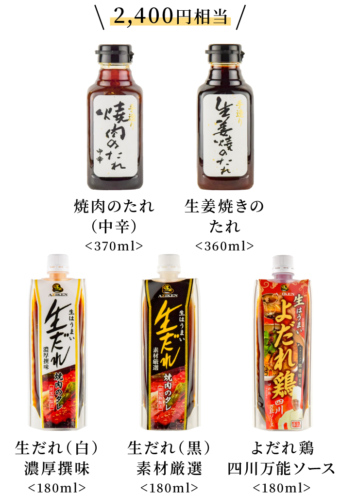 焼肉はもちろん、たれそのものが美味しいからどんな料理にも使えちゃう。無添加の「生だれ」に加え、にんにくと香ばしい香り溢れるこだわりの「焼き肉のたれ」、サラダチキンにひとかけするだけで味が決まる「よだれ鶏四川万能ソース」など、豪華な5本がセットに!