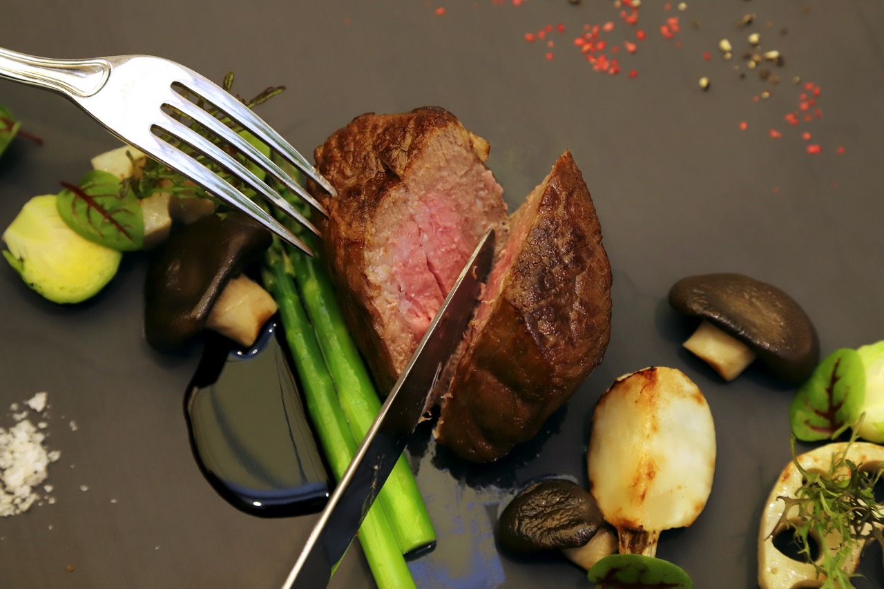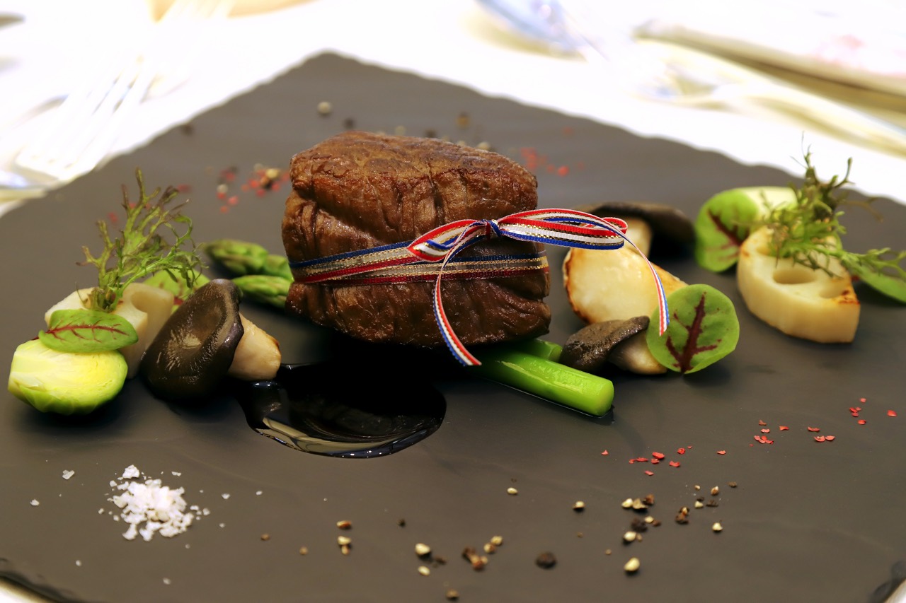 本日の和牛ランプ肉はすぅっとナイフが入るやわらかさで、凝縮した旨味と肉感が楽しめる最高の仕上がり。クリスマスリースをイメージした色鮮やかな赤ワインソースと野菜がテーブルを彩る。