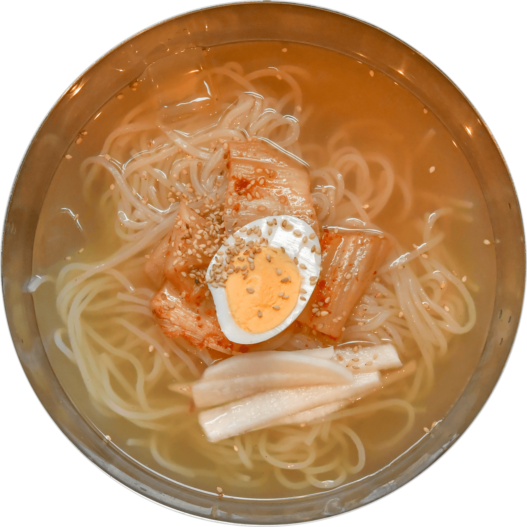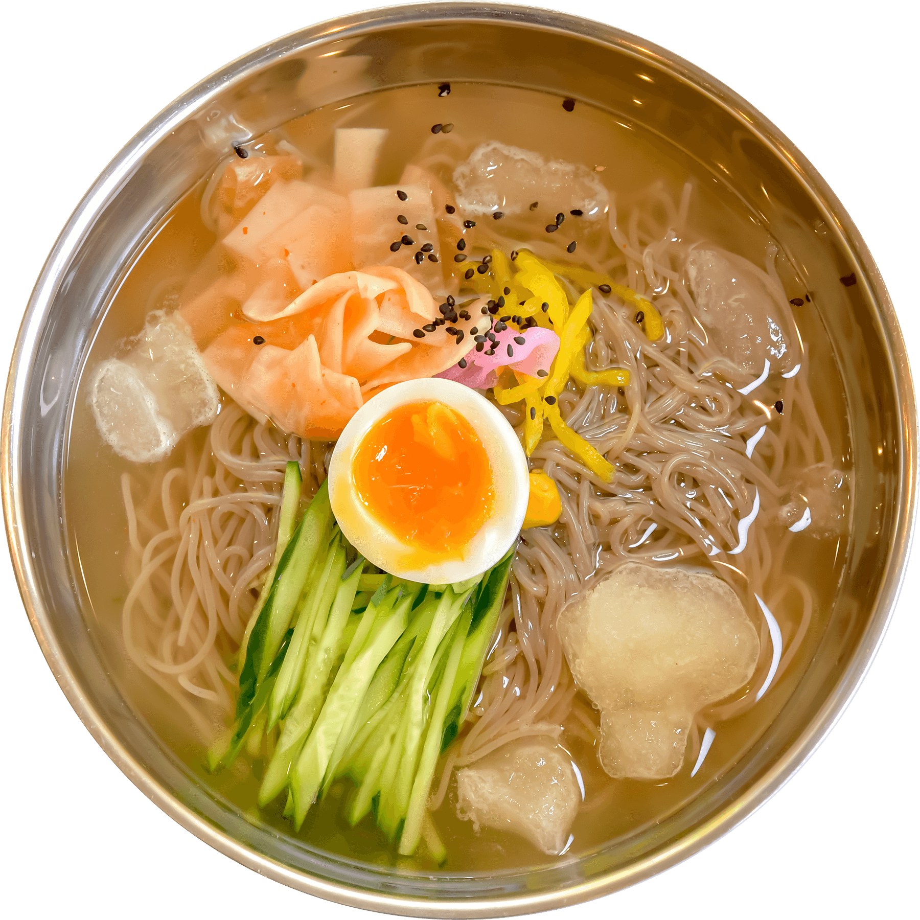 本場韓国の味わいを堪能!出汁氷を浮かべた、目にも涼やかな美しいスープとそば粉の麺。