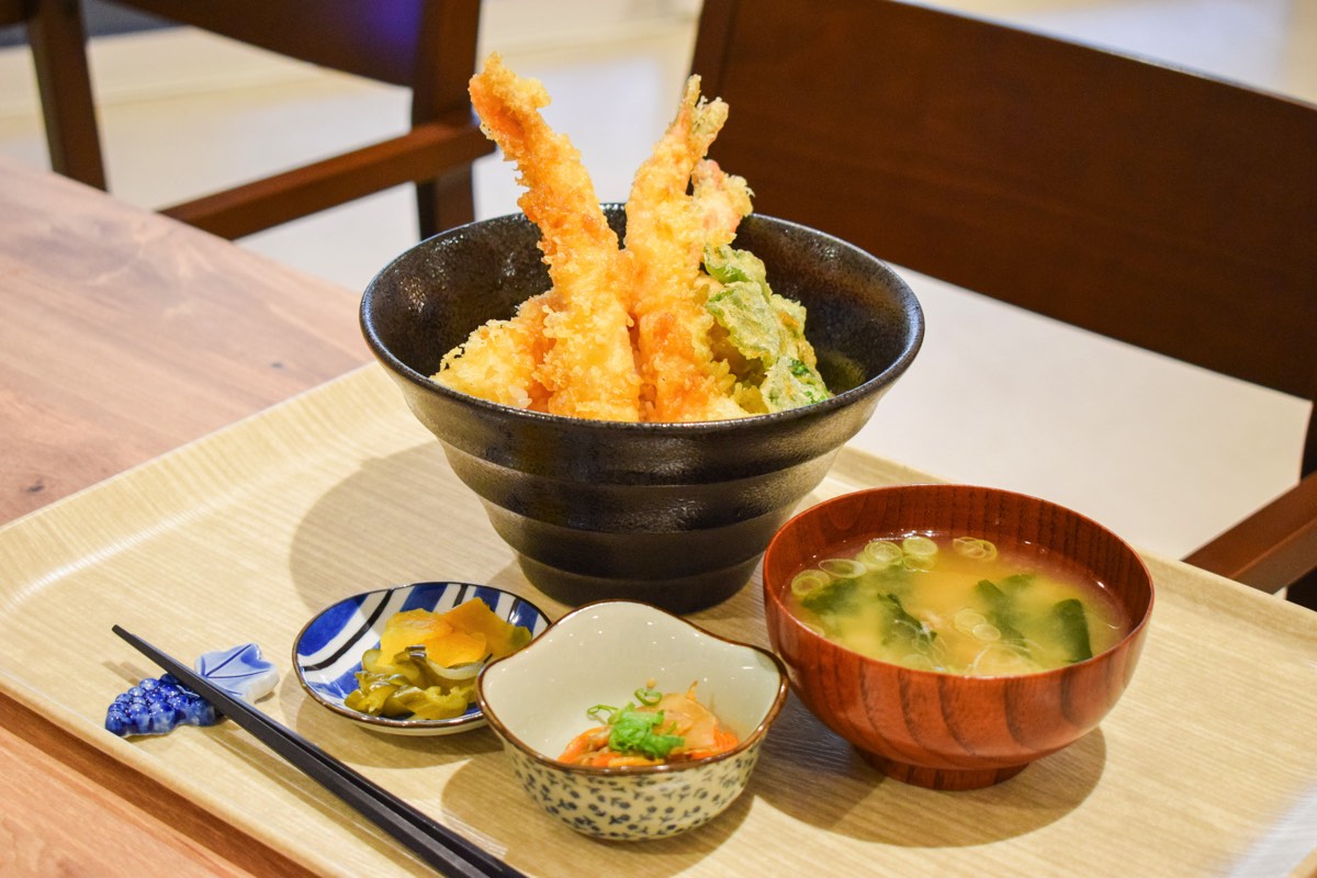 甲州市胡麻油がふわっと香り、さっくさくの軽くて歯ごたえのいい衣と、素材の旨味を堪能できる豪華、海老天丼。ご飯の上に盛った3尾