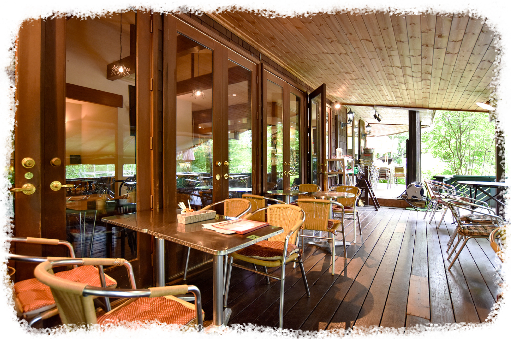 わんちゃんと一緒に利用できるのは、開放感抜群のテラス席とゆっくり寛げる専用席の2タイプ。テラス席には屋根がついているので天候を気にせず食事やティータイムを楽しむことができる。店内には可愛いグッズが並ぶショップコーナーも。散歩や買い物で萌木の村内をぐるりと一周楽しんだ後にホッと一休みするのにぴったり♪