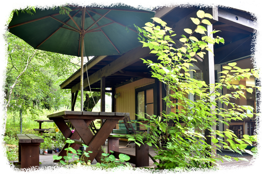 店内に入ると、愛らしい看板犬のケン君がお出迎え。とっても人懐っこい♪ワンちゃんと過ごすことのできるテラス席は、八ヶ岳の自然を満喫できる特等席。ゆったりとしたひと時を愛犬と一緒に過ごせるのがいい。屋根があるから雨の日でも安心。また店内では、有機やグルテンフリーの食材を販売しているのでお土産にも。