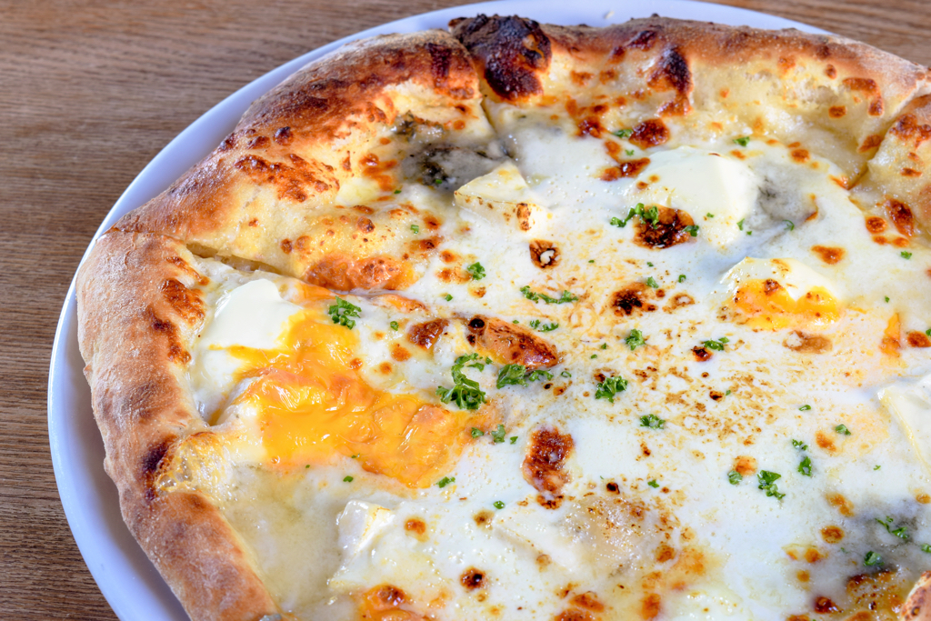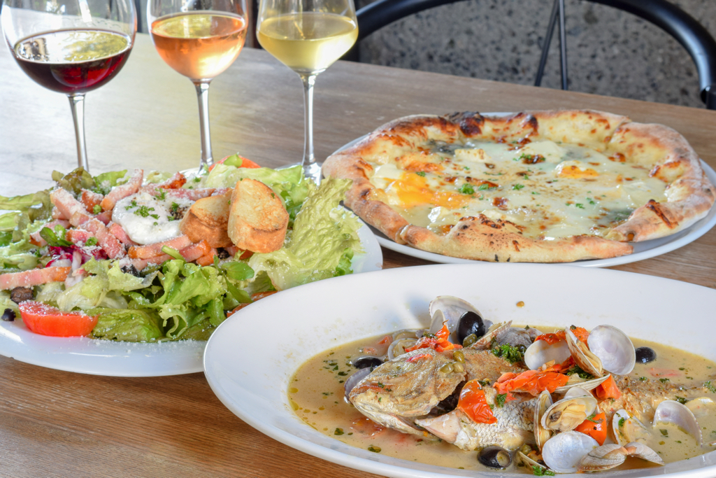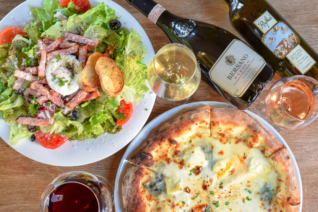 ピザのチーズやソーセージ、デザート、シャーベットに至るまで、すべてイチから手作りする。それは、できるだけ安心安全な体にいいものを…という思いから。美しい巨峰のワインをはじめ、種類豊富なワインと共に味わって。