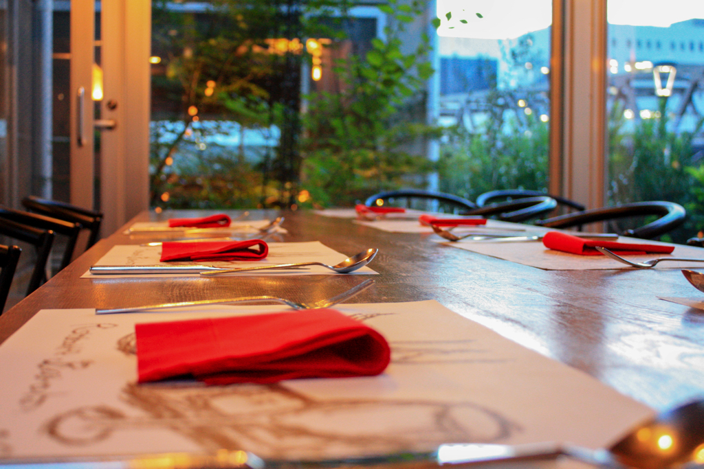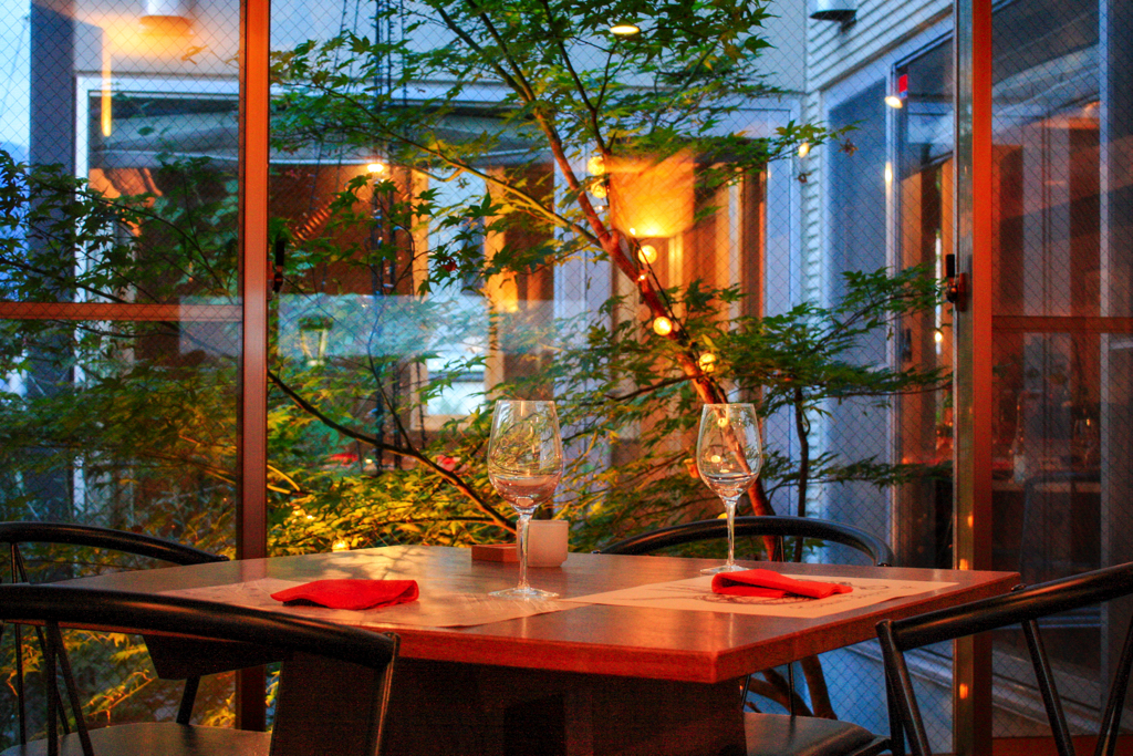 甲府駅北口からすぐという便利なロケーションながら、店内からは公園が見渡せ、リラックスできる。大きな窓からは緑溢れる景色が楽しめて開放感も抜群。ガラス張りの個室を贅沢に使ってワインパーティを楽んでみては。