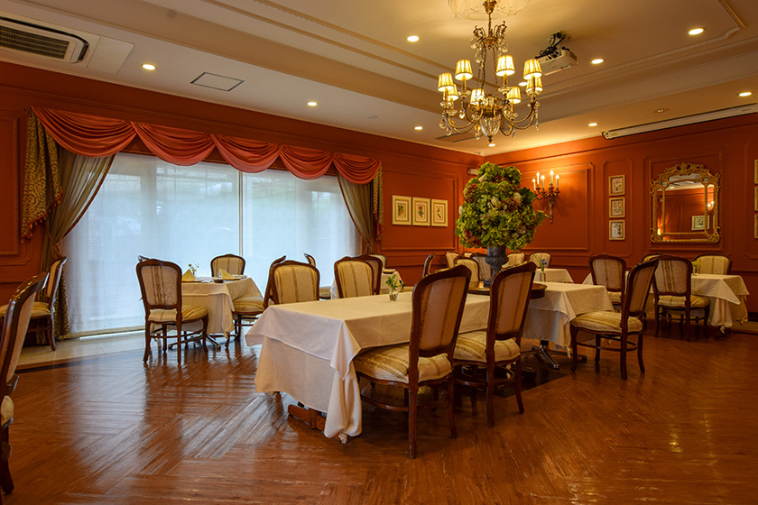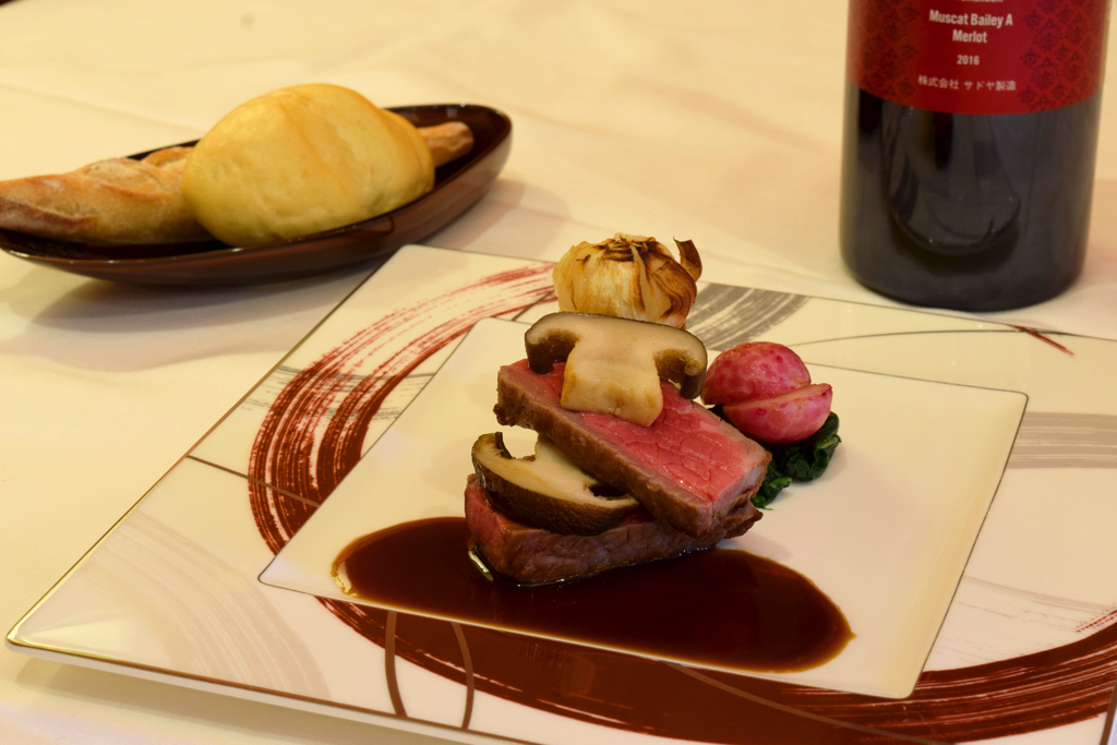 ワインと料理の調和を一番に考えた、県産食材を使ったコースがパーティを華やかに彩る。香味豊かなバランスのいいワインは、料理を一層美味しく引き立てる。コースは前菜、スープ、肉料理、デザート、パン、コーヒー。