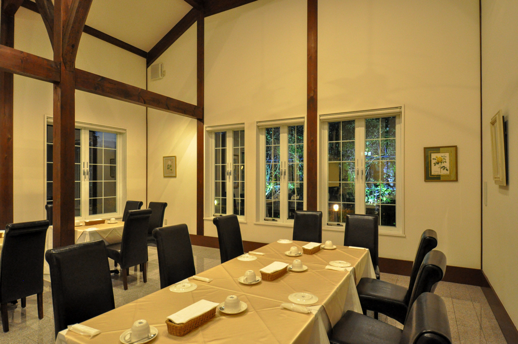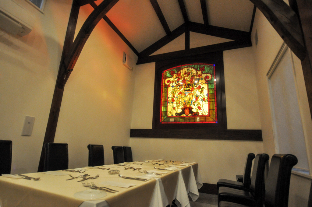約500㎡の開放的なメインダイニングは、ライトアップした庭園が眺められムードたっぷり。2名でも贅沢に個室貸切が可能(無料)。ステンドグラスが美しい部屋や邸宅リビング風の部屋など、多種多様の個室がある。