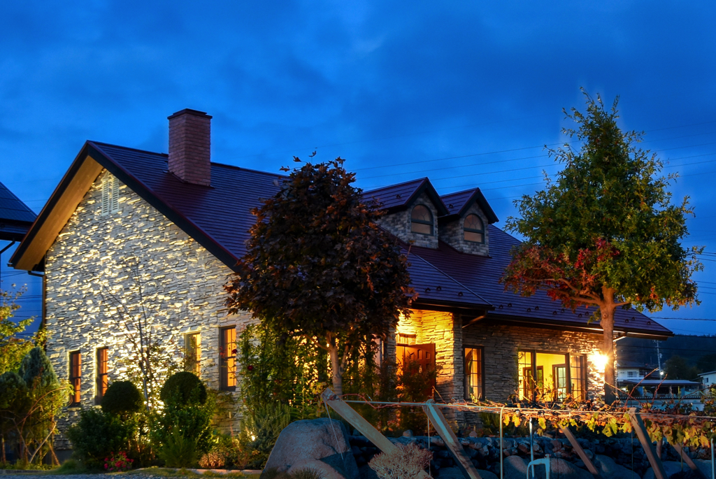 北に八ヶ岳、西に甲斐駒ケ岳、南に富士山というパノラマビュー。窓越しから眺める風景がフランスに旅したような旅情を誘う。2000房が実るぶどう畑も圧巻。ワインのほか、フルーツフレーバーの緑茶や葡萄ジュースも。
