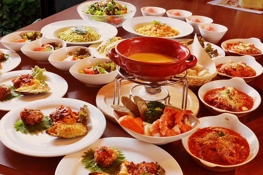 メインが一人ひとり自由に選べると大好評。パスタ、ピザ、グラタン、バランスプレートなど人気メニューが揃う。前菜5品、サラダ、スイーツ4種の盛り合わせに、好きなドリンク(お酒も)3杯が付いて、なんてお得!