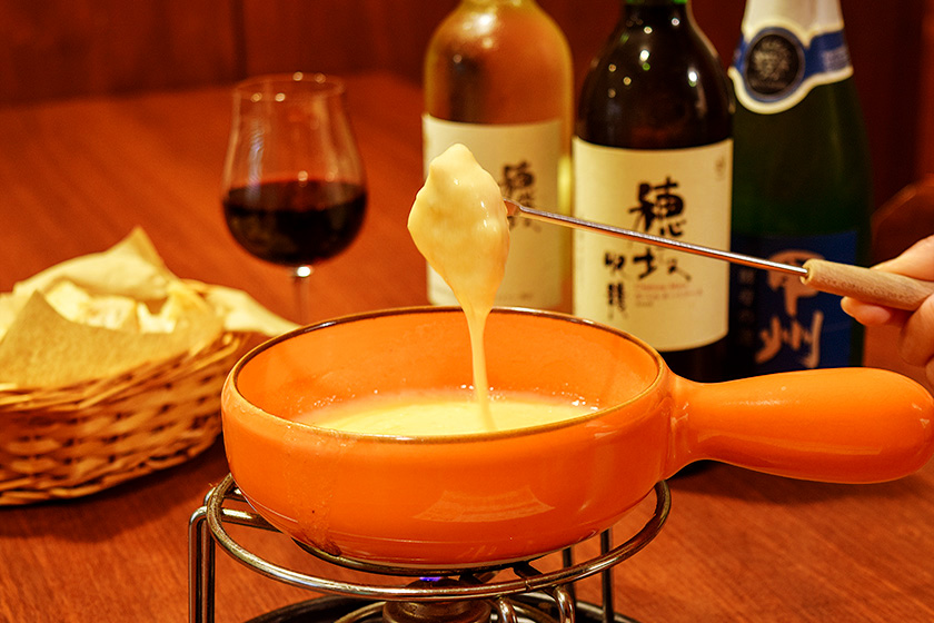 冬限定のとろ~りチーズフォンデュが主役!濃厚チーズにワインやビールなど、お酒が進む。充実度抜群の内容は前菜3種に甲州牛ローストビーフ、広島産大粒カキフライ、有機豆腐バーグの野菜グラタンなど、全9品!