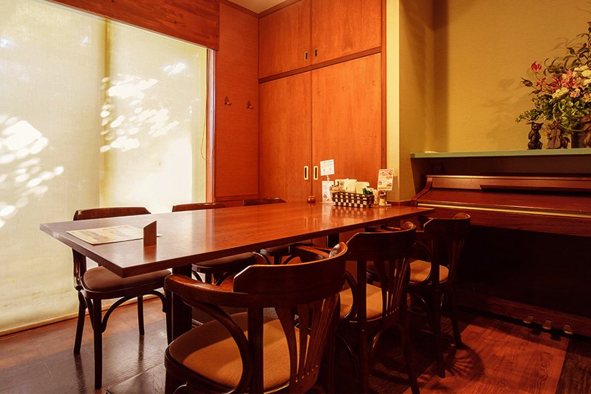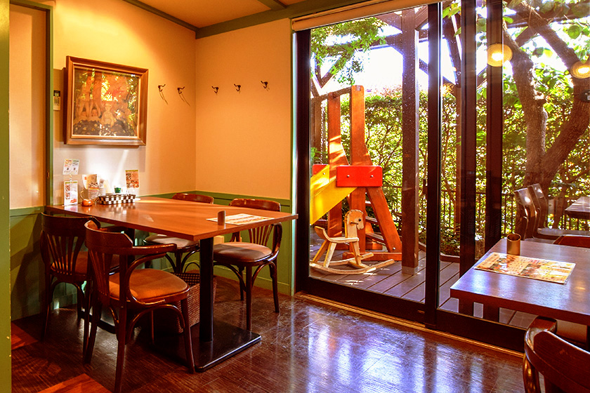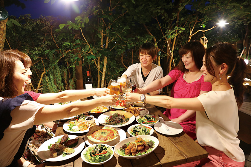 木の温もり溢れるナチュラルテイストな空間は、カジュアルなパーティにピッタリ。緑に囲まれたウッドデッキがロマンティックな雰囲気にも一役買ってくれる。庭付き個室は4つ。人数に合わせて対応可能なのも嬉しい。