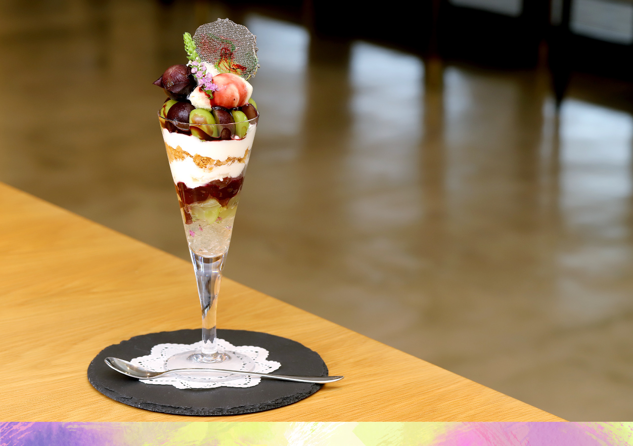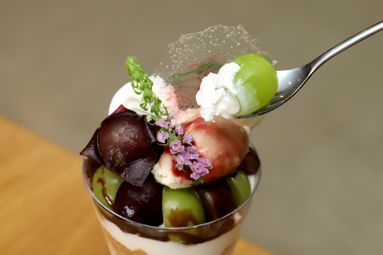 ぶどうの切り方や見せ方にこだわり、山梨県産の巨峰とシャインマスカットを贅沢にアレンジしたグラスデザートは、空間使いが何ともクリエイティブ!