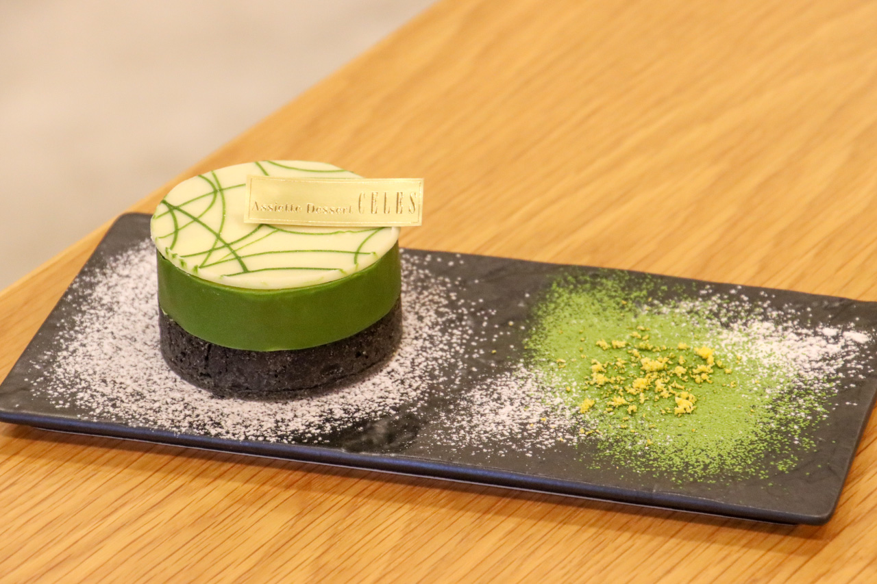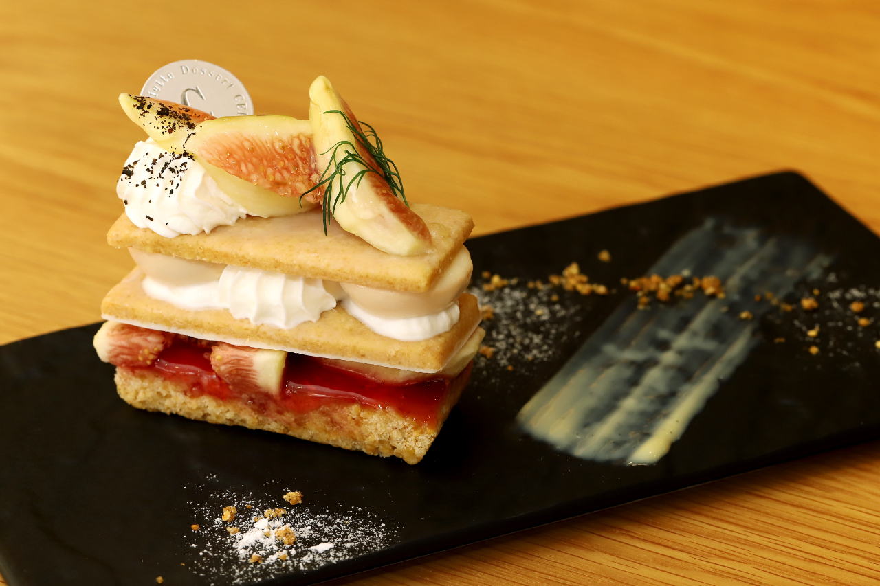 アピオ1階、美しいひと皿盛りのデザート「アシェット デセール」専門店は、まずそのデザイン性に目を奪われる。かなり角度をつけた今年のぶどうパフェは、セレスカフェ流の斬新な発想と確かな技術で勝負。誰もが美味しいねという定番の構成を捨て、スパイスや調味料とぶどうの妙なるマリアージュを堪能できる逸品に仕上げた。