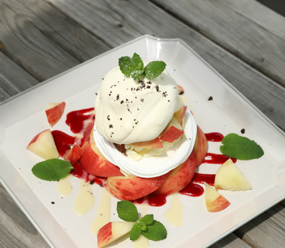 フルーティでさっぱりとした桃氷と桃のジュレ、そしてアクセントのマスカルポーネが三位一体となり、見事なバランスでフレッシュな桃の甘みを引き立てる。