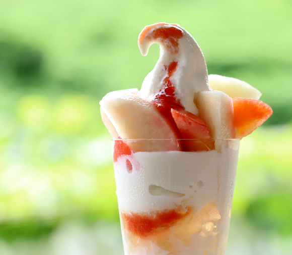 とろぉ~り今にもこぼれそうなクリームはヨーグルトのさっぱりした風味が特徴のエスプーマクリーム!桃のソースは笛吹市の農園から直接仕入れた新鮮な桃と、てんさい糖や黒糖など5種類の砂糖を使ったシロップを使い、手間暇かけて仕上げた渾身の逸品。ふわふわな氷にとろみのあるソースが絡まって、食べた瞬間、お口の中が幸せ~!