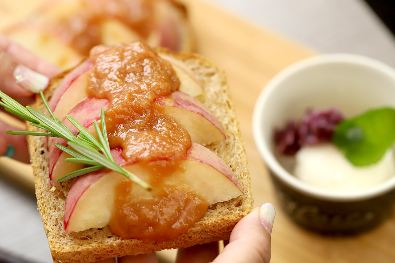 山梨市の人気パン店「丸山パン」のチーズナンに新鮮な桃をトッピングし、さらに自家製のキーマ風カレーとチーズを乗せこんがり焼き目を付けたお食事系メニュー。