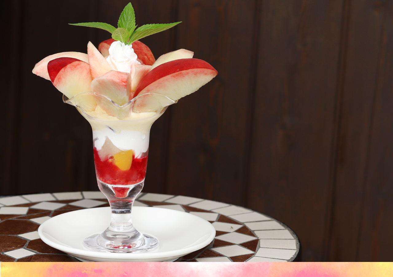 時期ごとに自家農園で食べ頃を迎えた桃を丸ごと1個使用し、華やかに仕立てたパフェ。