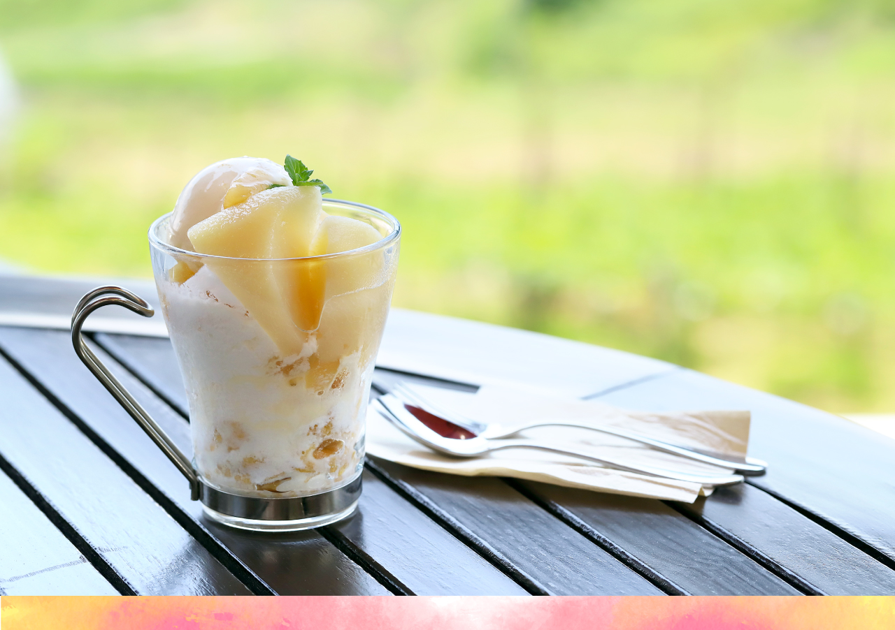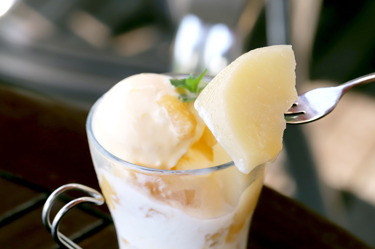パフェでも使用されているこのコンポートは、シロップが中まで染み込んでいるのにフレッシュな果肉を思わせる食感が残っていて、食べ応え満点!
