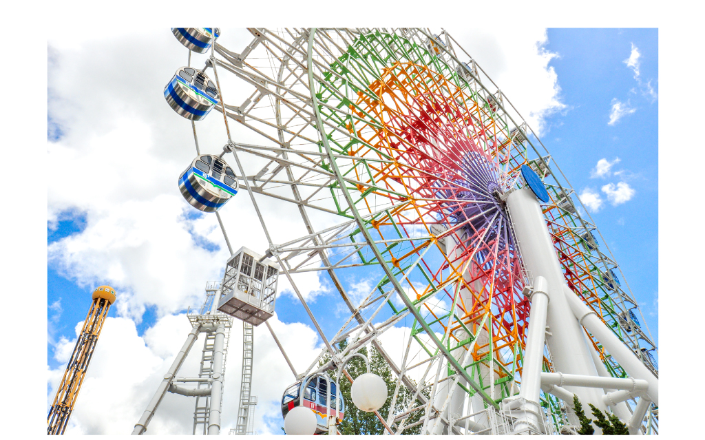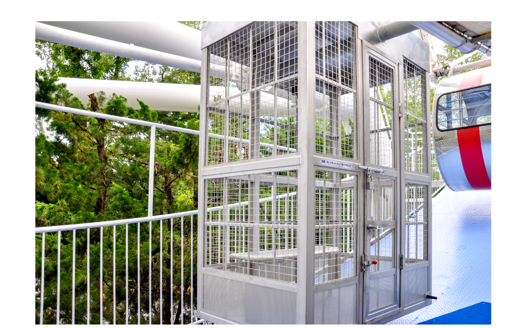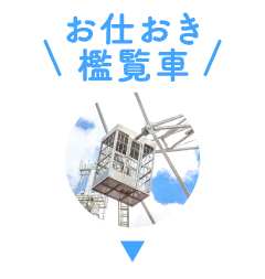 園内中央にある高さ50mの大観覧車「シャイニング・フラワー」の中に、あれれ、何やら怪しげなゴンドラが2基…。こちら、2021年7月21日よりお目見えした、壁一面が檻状のステンレス網で囲まれた、お仕置き檻覧車『監ごくん牢ごくん』!