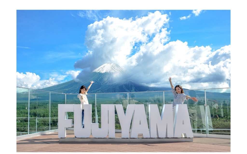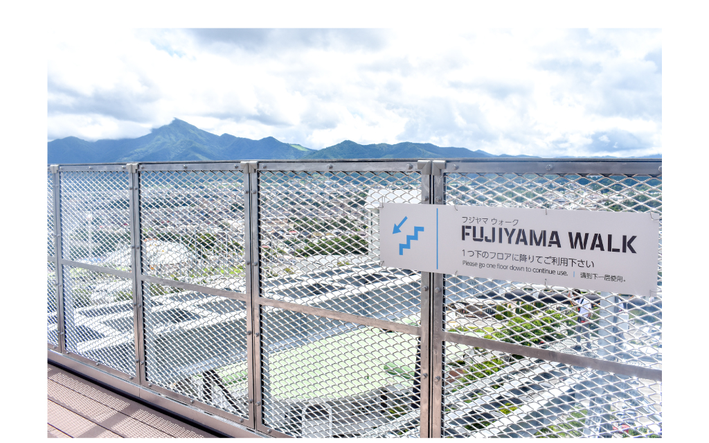 エレベーターを降りると、目の前には雄大な富士山がドーンとお目見え。視界がパァ~っと開け、眼前にさえぎるものが一切ない絶景が広がる。「FUJIYAMA」の巨大文字の後ろに立ってパシャリ。これは、この上ないフォトジェニックなロケーションだ。