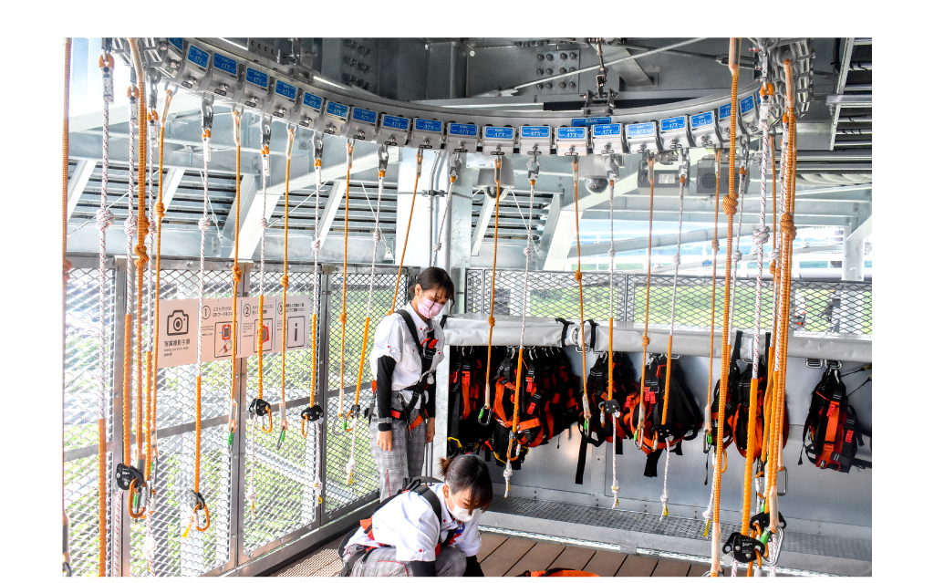 さすがは高所点検作業が日課というだけある富士急ハイランド、ハーネスがズラリと並び、何やら物々しい雰囲気が漂う。がっちりとハーネスを装着し、安全確認を何度も行い、準備が整ったらいざしゅっぱ~つ。
