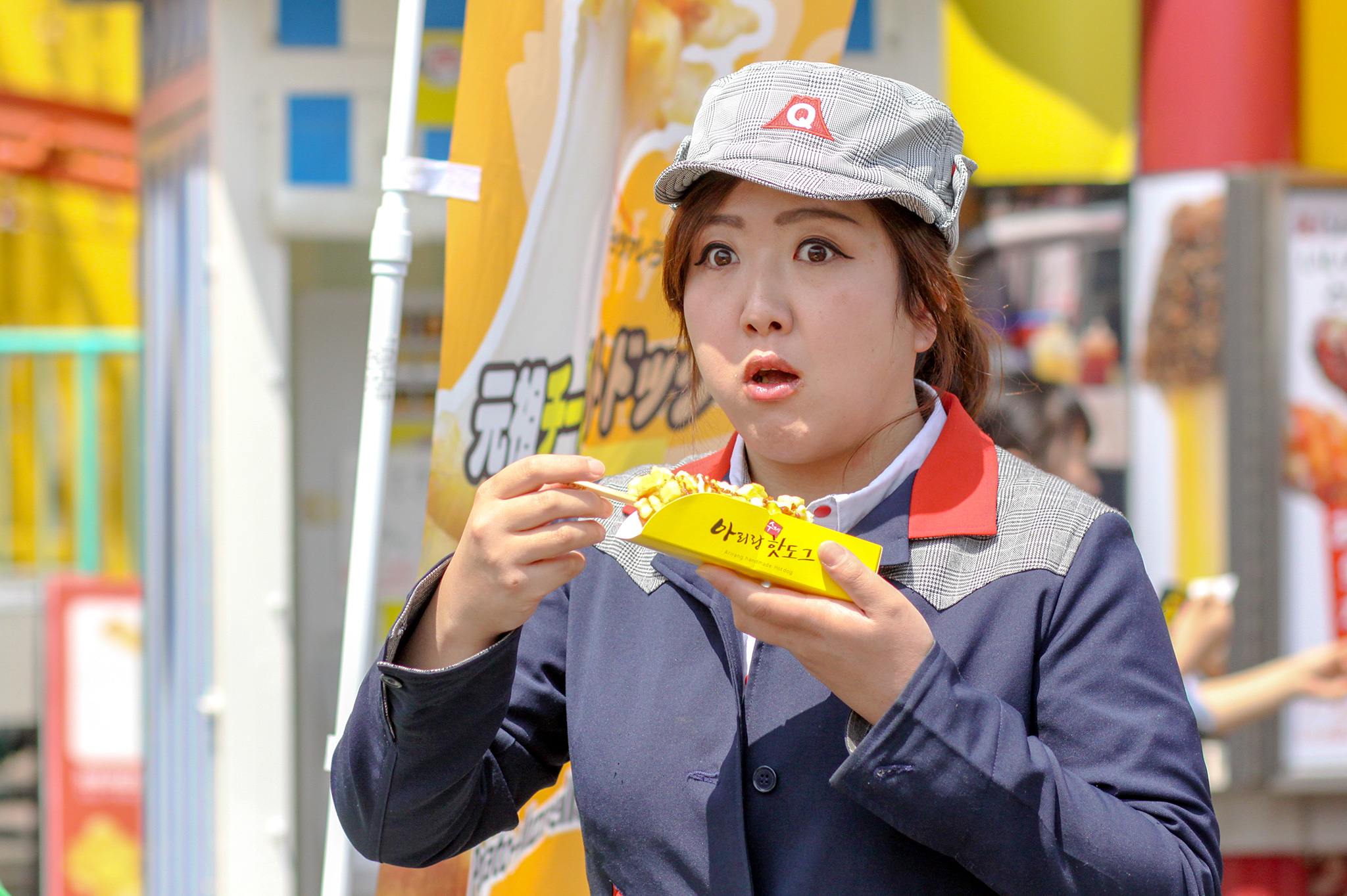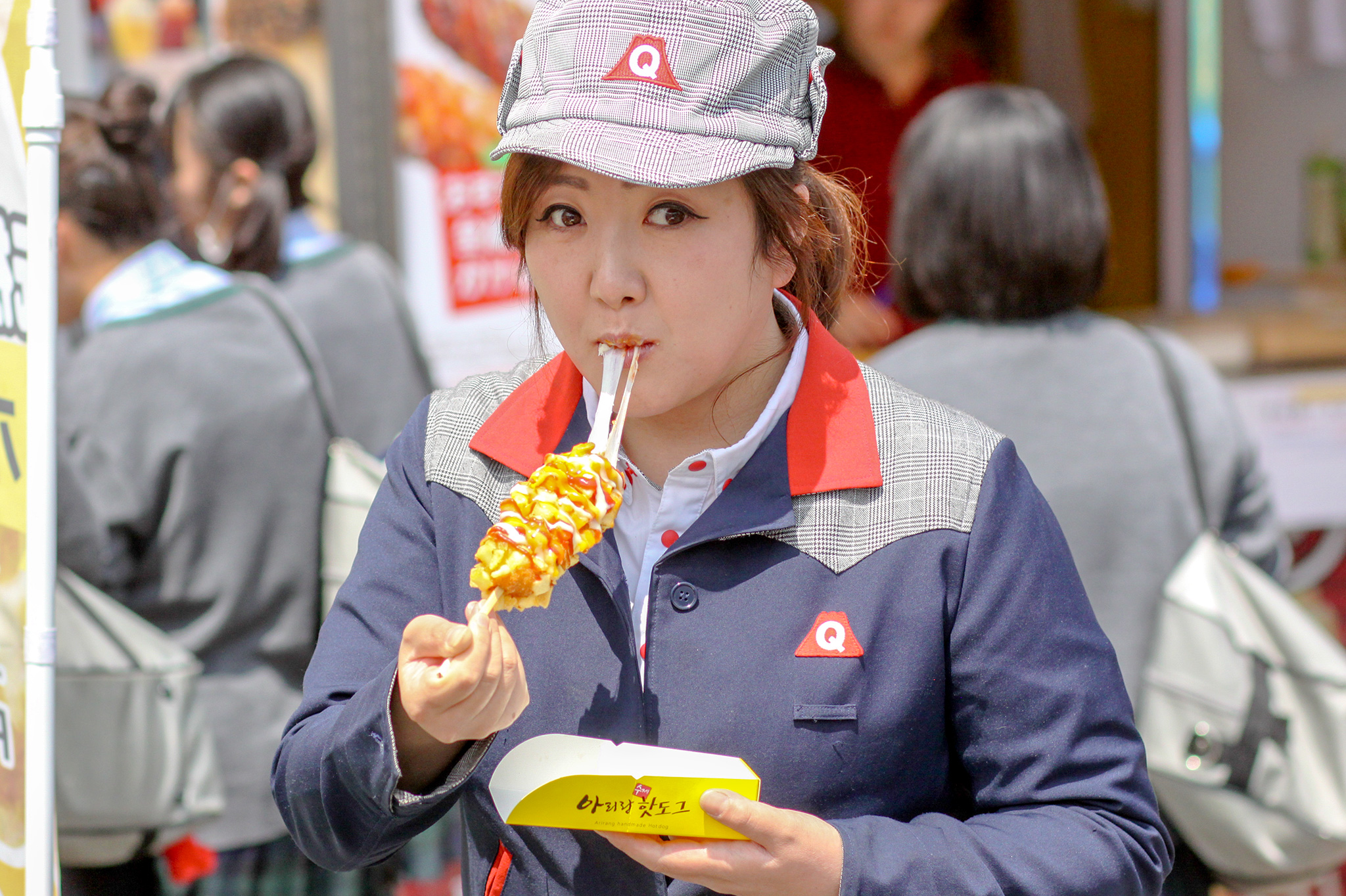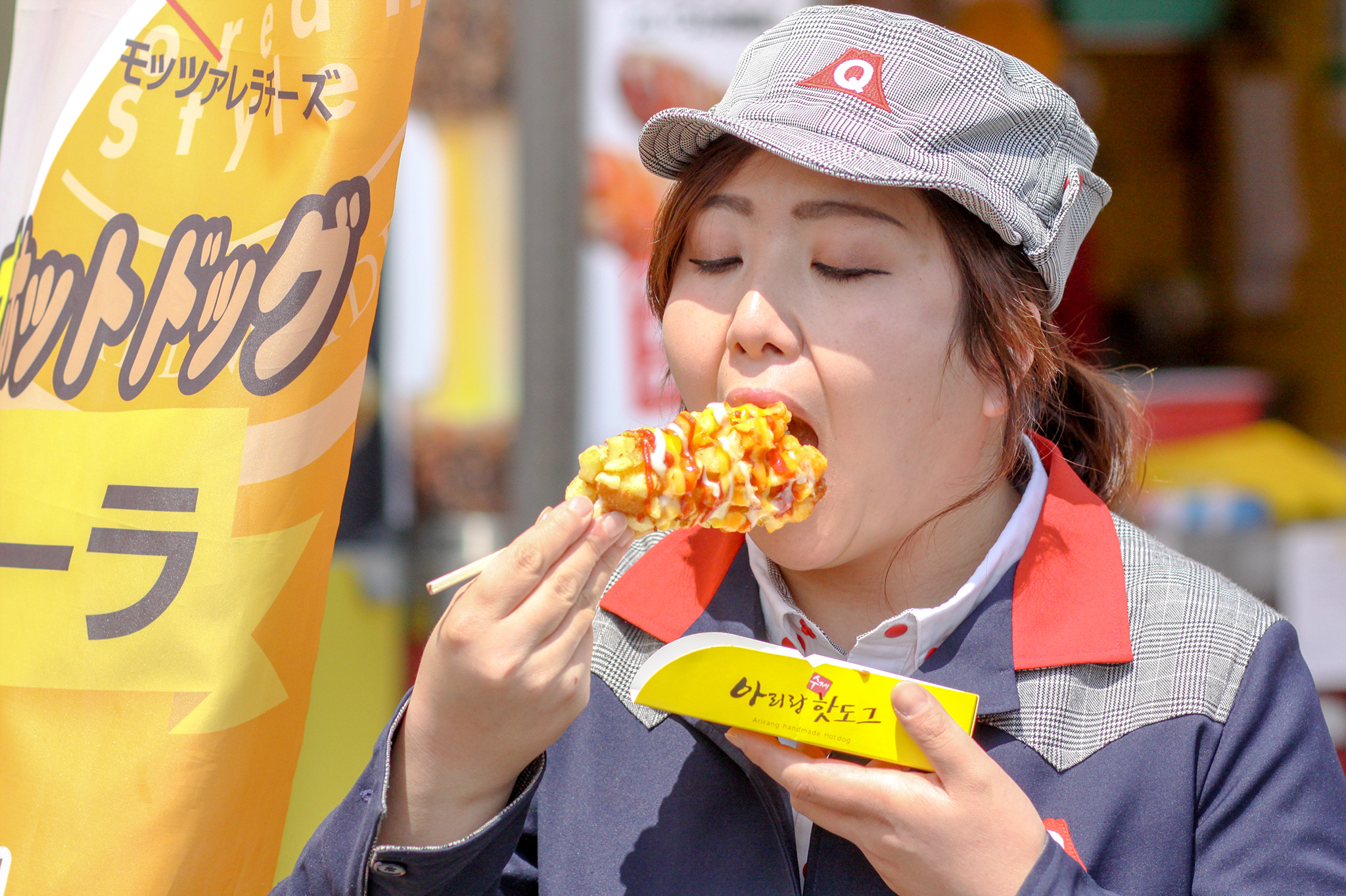 園内に行列発見!これが韓国発・新大久保で大ブレイク中ののびるチーズドック!女子高生に混ざって、なんとNo.1人気のポテトレーラを頬張るスタッフ一人!?しかも5種類のソースを全部がけとは!ん~のびるのびるのび~る!