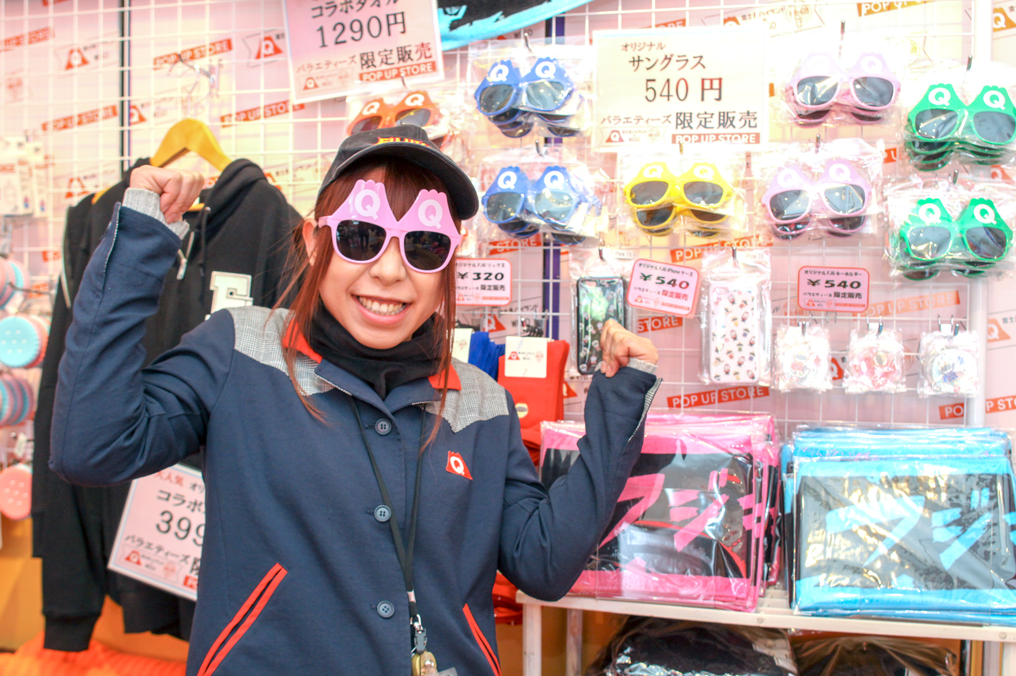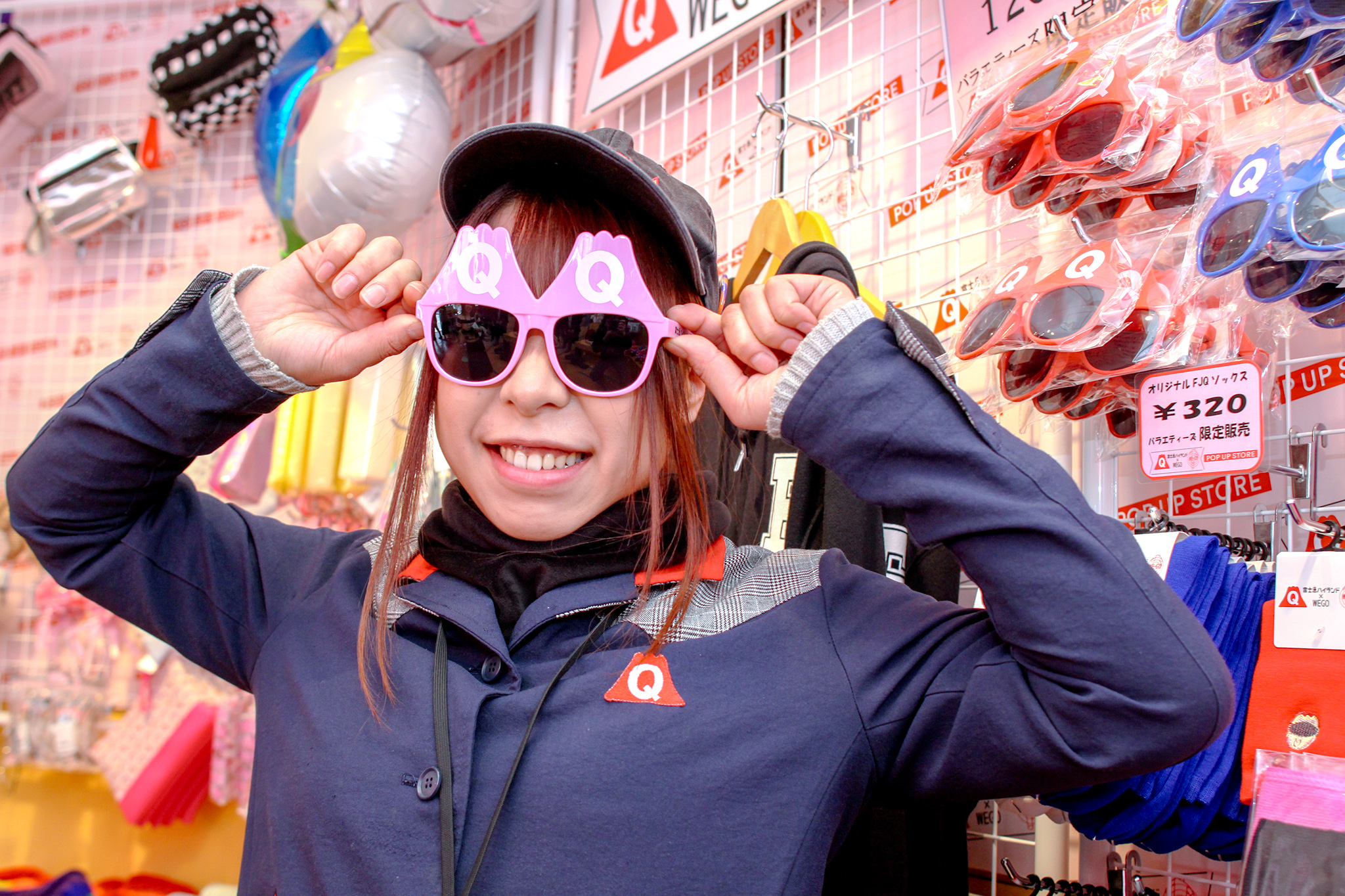 FUJIYAMA下のおみやげショップでは、テンション高くカラフルなサングラスを試着!プライベートで遊びに行く時、友達と色違いで盛り上がろうと、早くもシミュレーションか!?「ピンクとったぁ~♪」