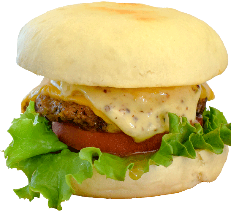 昭和町南アルプスの人気パン屋さん「ルーブル」がハンバーガーのために開発した、100%国産小麦の特製バンズはオーダーが入るたび鉄板で温め、まわりはカリッと中はふかふかに仕上げる。牛肉100%のパティは塊バラ肉を店内で挽き