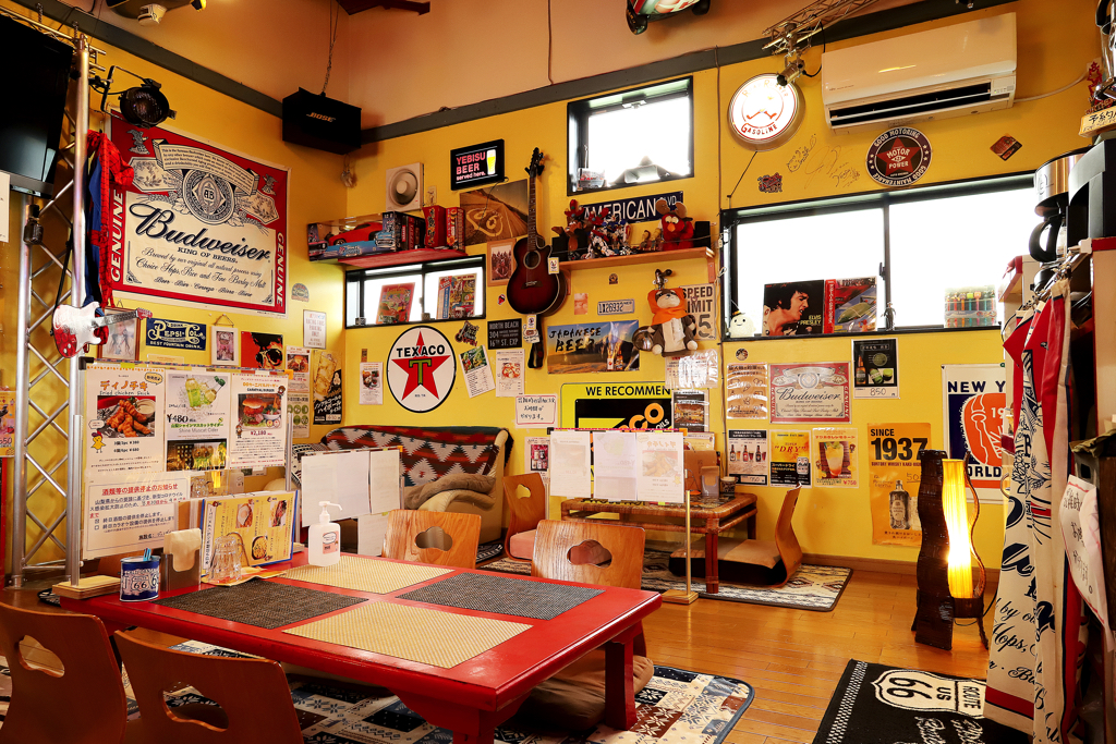 新入りのインディアンの置物「まさおくん」が見守る店内は、アメリカンテイストで統一されたファンキーな雰囲気。